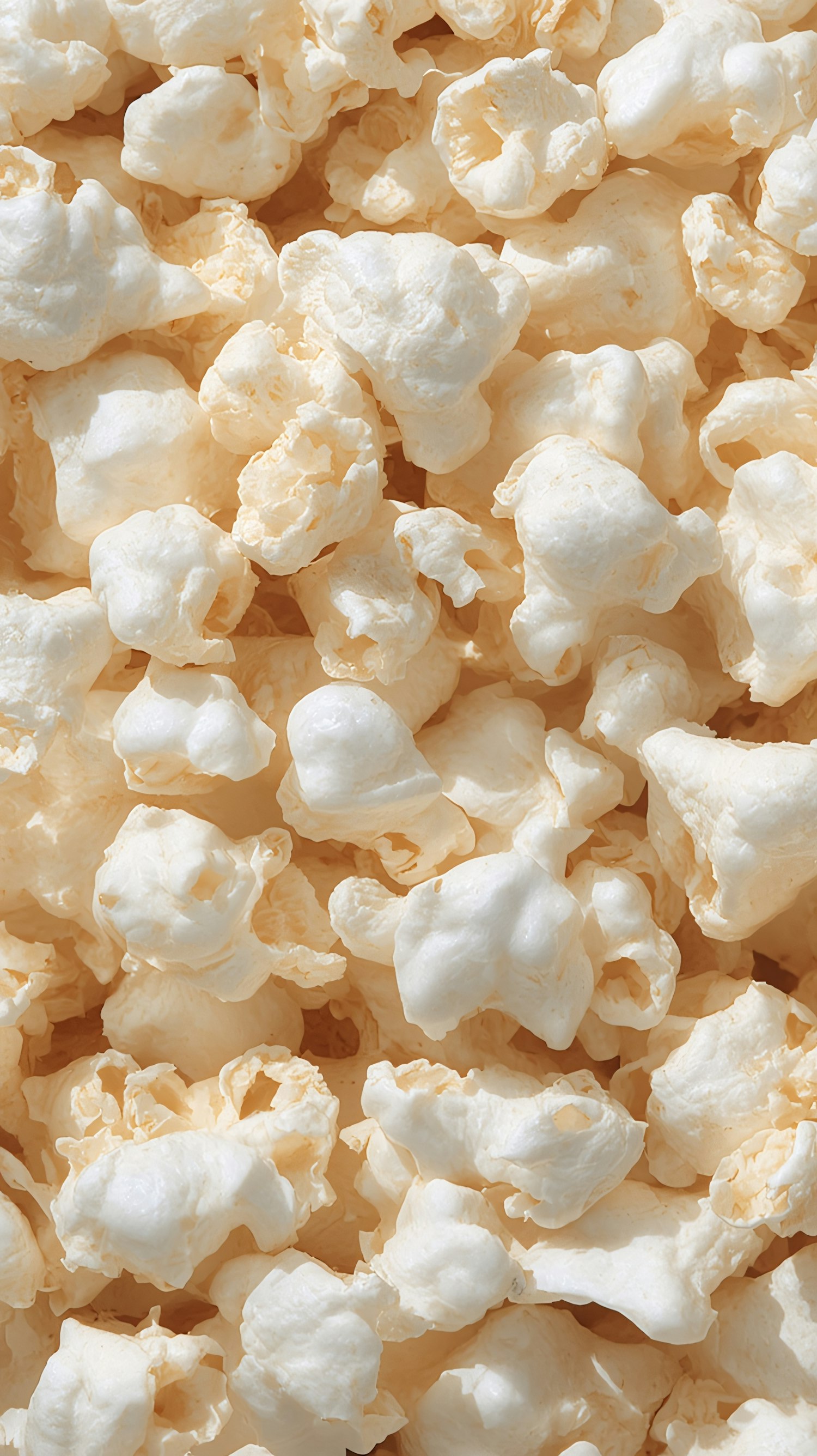 Close-up of fluffy, freshly popped popcorn with intricate textures and light tones, filling the frame with a crispy, airy appearance.