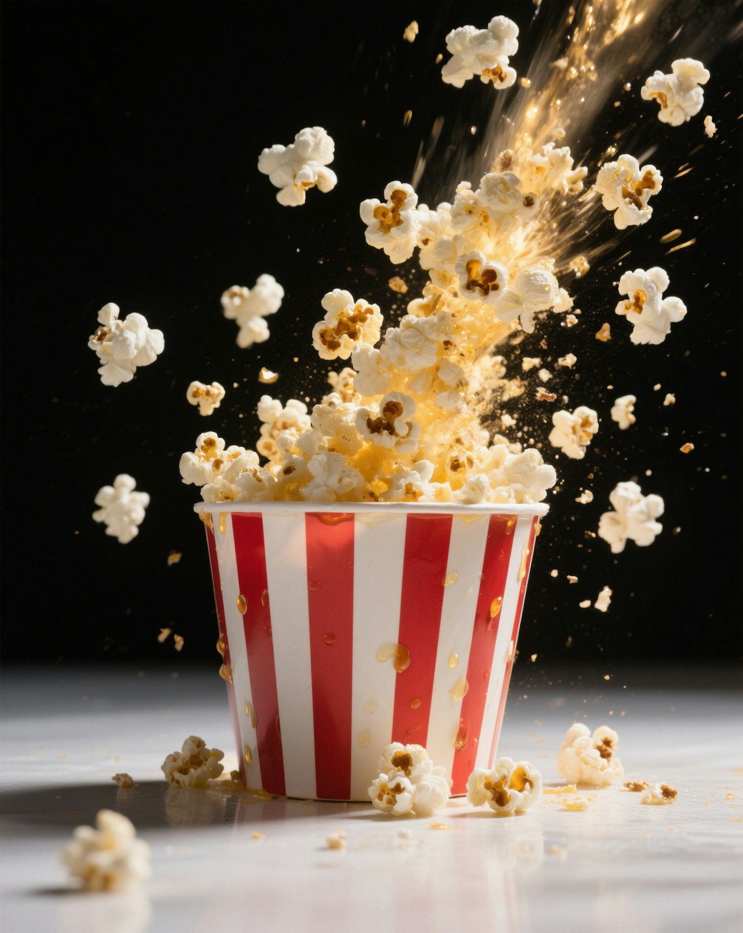A high-speed cinematic food photography shot of popcorn blasting out of a red-and-white striped tub, captured mid-air against a deep black theatrical background. The popcorn is in motion — some kernels are frozen mid-pop, some tumbling out of the tub, and others suspended in mid-air with slight motion blur for realism. The tub is centered at the bottom of the frame, shot at a slight upward angle (camera placed low, around 25 degrees) to give the flying popcorn a larger-than-life feel. The tub is sharp, while the popcorn explosion rises diagonally across the frame with selective depth of field, giving a sense of movement and depth. Lighting is dramatic and cinematic — a warm, focused key light from above and slightly behind the subject, creating golden highlights on the popcorn’s textured surface. A low-powered back rim light adds subtle separation and glow to airborne kernels. Shadows fall softly on the tub, and the background remains entirely black for theatrical contrast. Each popcorn piece is highly detailed: crispy folds, air-puffed creases, tiny butter droplets on the surface. Butter is applied lightly — just enough for glisten and shine without overwhelming. A few popcorn pieces are captured at peak action, with slight blur and trailing crumbs to enhance realism. The color palette is natural — warm whites, golden butter, subtle char specks, with the iconic red-and-white tub as a bold contrast. The black background emphasizes the popcorn's texture, making the scene feel fun, luxurious, and high-impact. Ultra-realistic, high-speed photography style, frozen motion, food advertising quality. A perfect blend of chaos and craving.