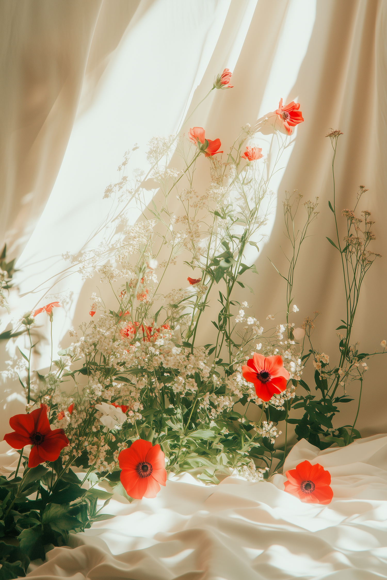 Bright red poppies and delicate baby's breath flowers in soft sunlight, set against a cream fabric backdrop for a dreamy, serene vibe.