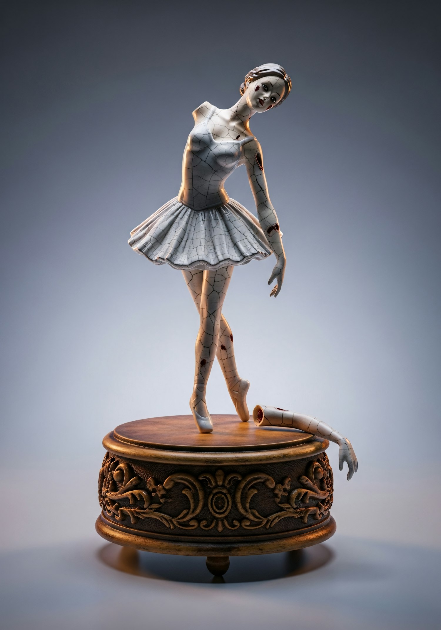 A cracked porcelain ballerina figurine on a carved wooden music box, showcasing elegance and fragility in a dramatic composition.