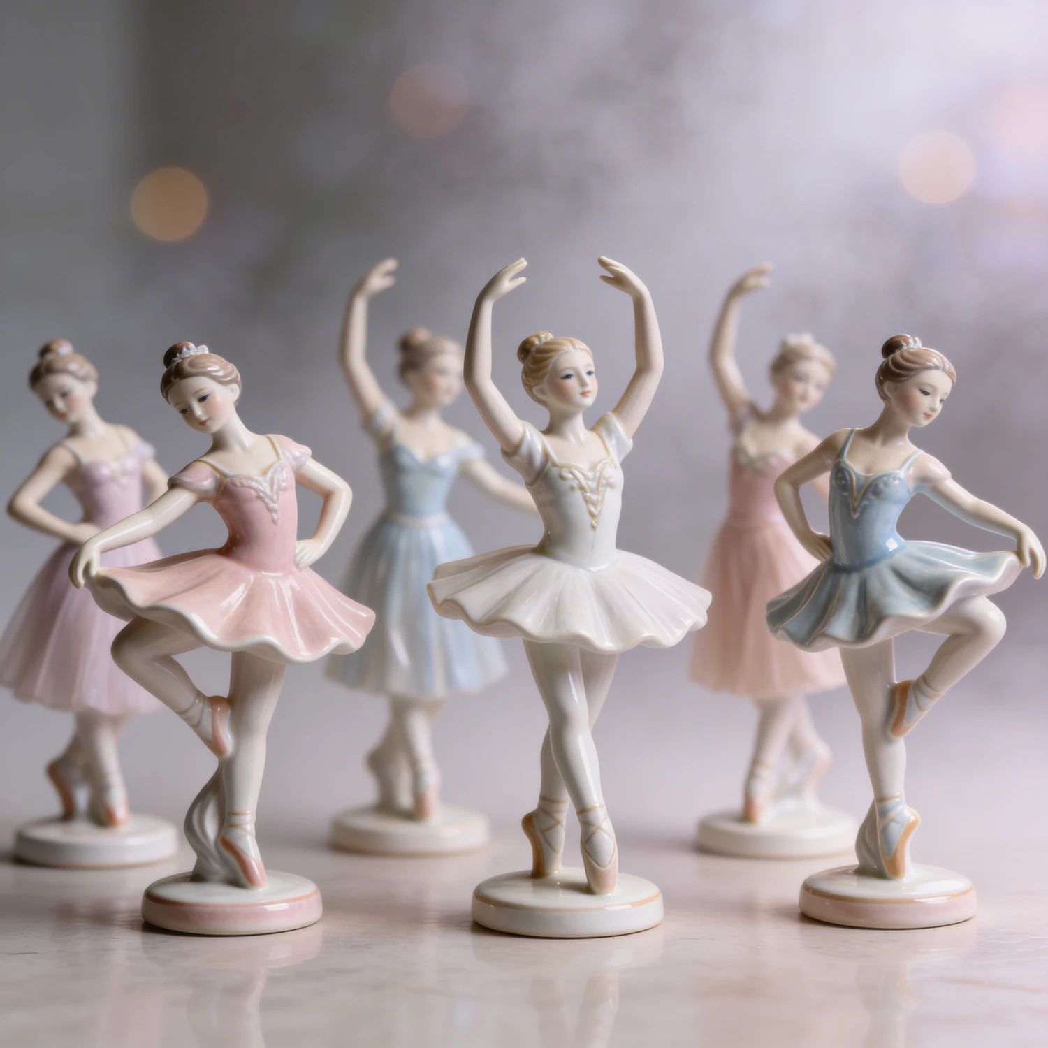 Porcelain ballerina figurines in pastel tutus, posed gracefully on a smooth surface with a dreamy, softly blurred background.