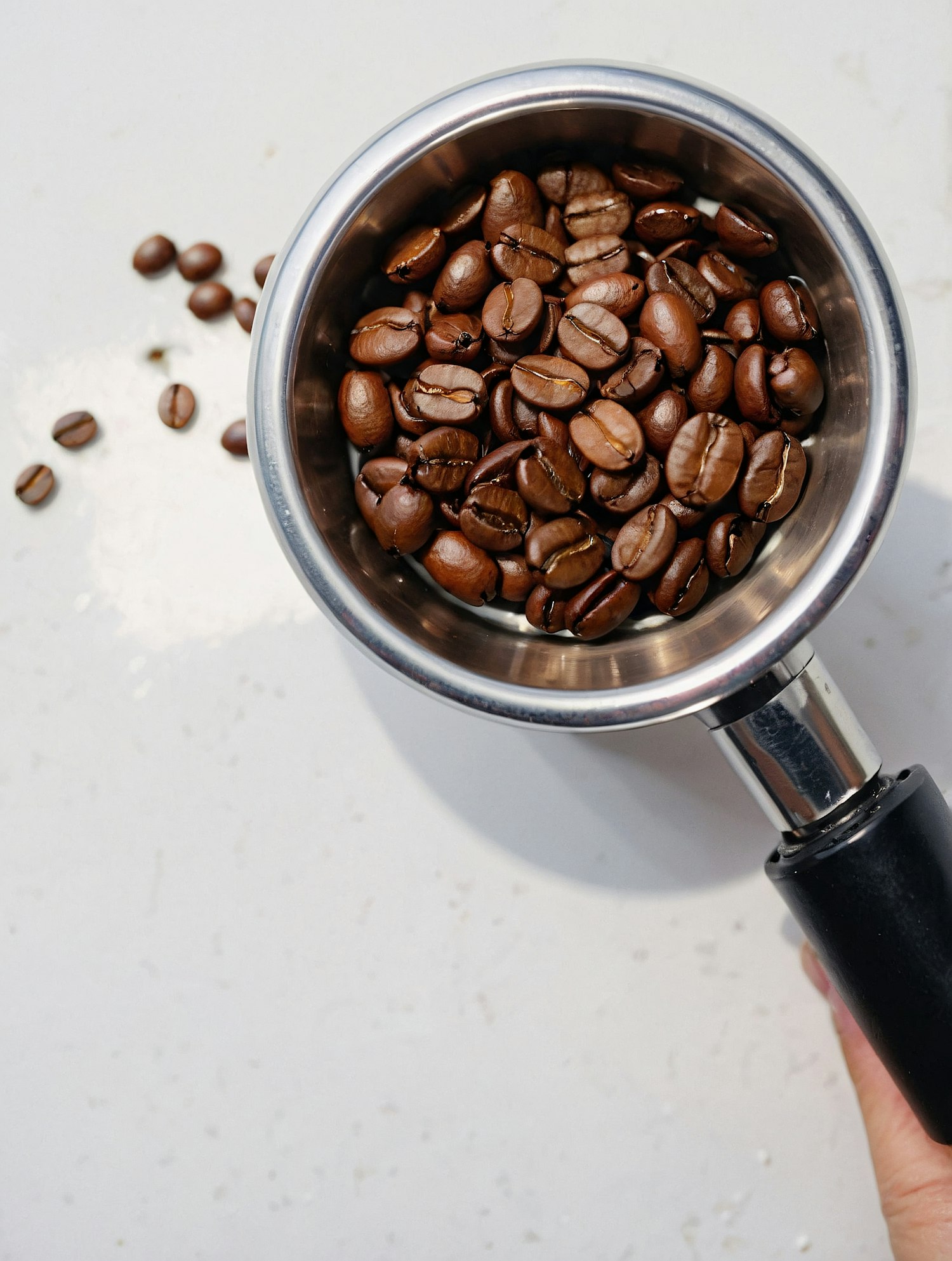 Close-up of a portafilter filled with roasted coffee beans, held over a clean white surface with scattered beans.