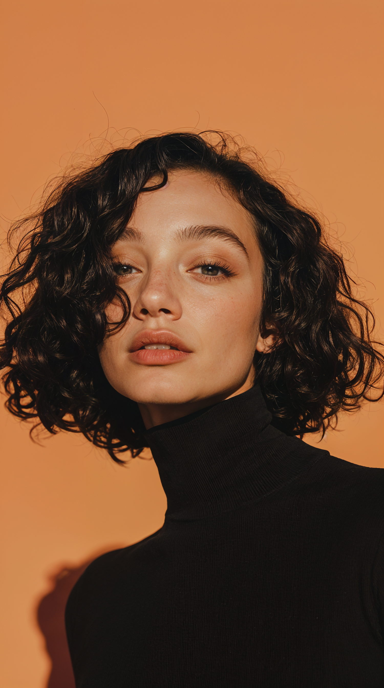 Portrait of a young woman with curly hair and blue eyes against an orange background, wearing a black turtleneck.