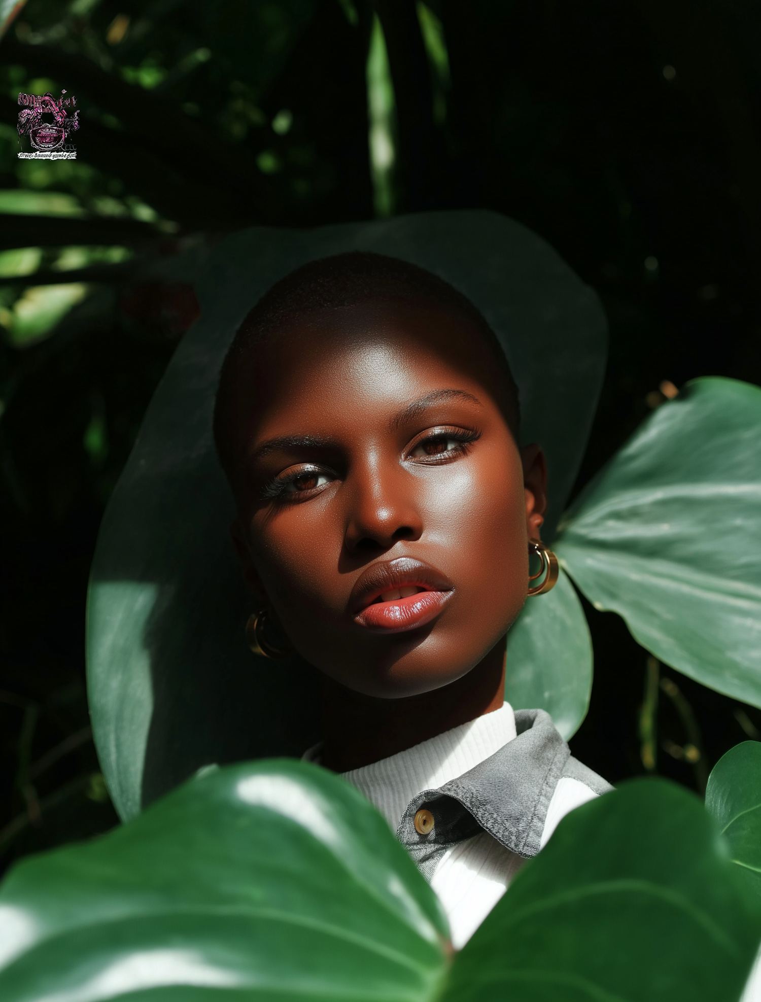 Stunning portrait of a person with glowing skin amidst vibrant green foliage, capturing harmony between natural beauty and light play.