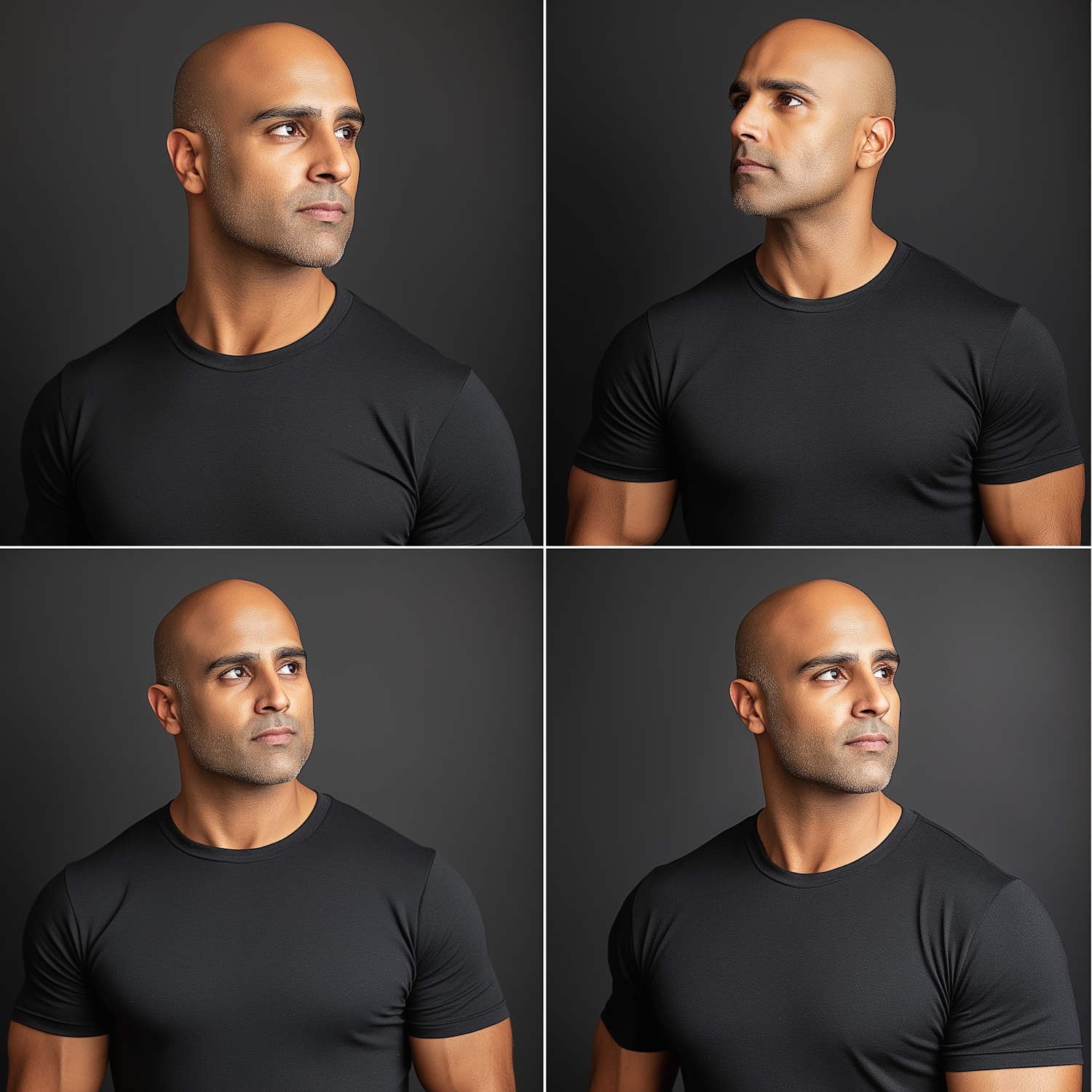 Bald man in black t-shirt poses with serious expression against dark background, showcasing muscular build and contemplative gaze.
