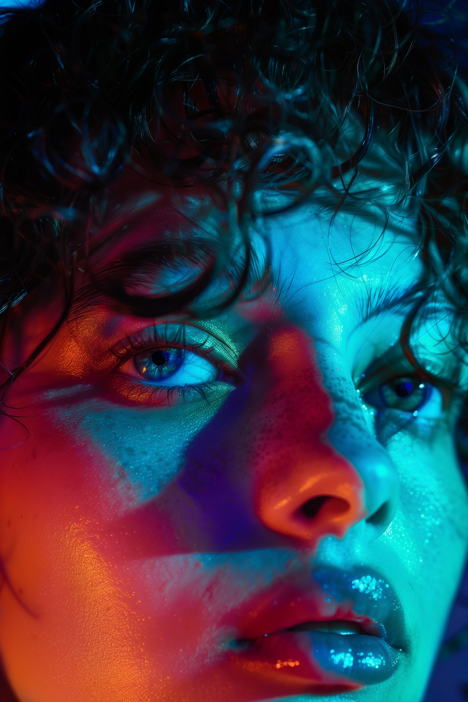 Close-up portrait with vibrant multicolored lighting, highlighting blue eyes, glossy lips, and curly hair for a dramatic effect.