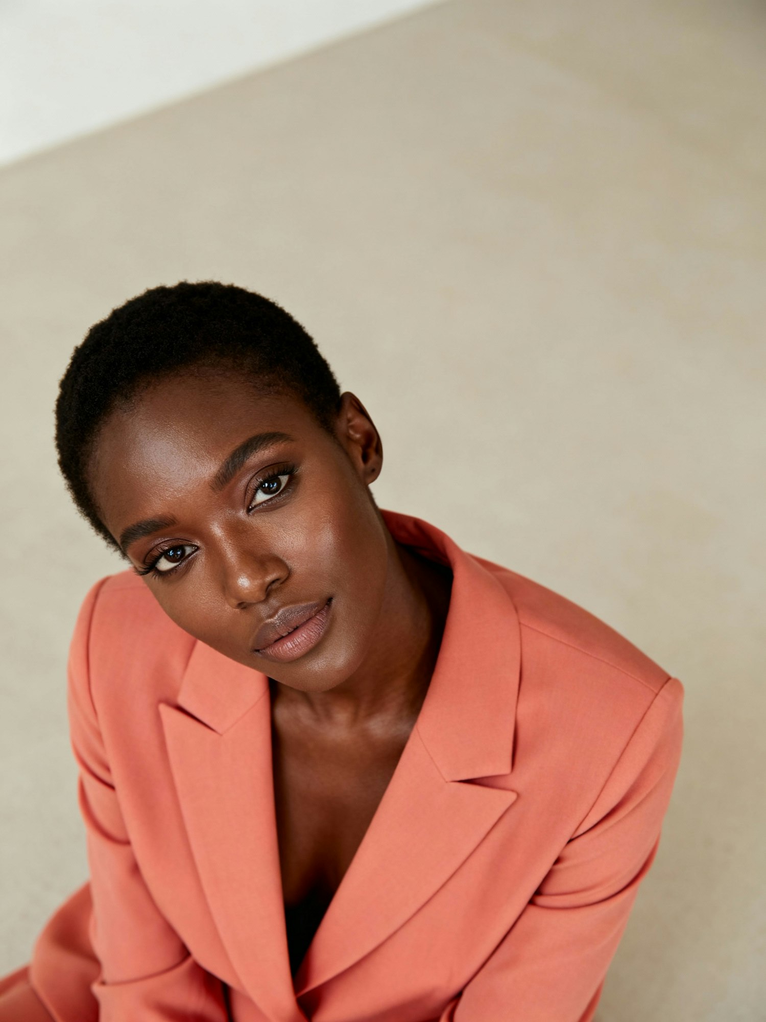 High-definition portrait of a stylish Black woman wearing a soft coral blazer that complements her glowing skin. She poses with calm confidence against a neutral, minimalist backdrop, allowing the warm coral tones to stand out. Soft, even lighting highlights her natural beauty, refined features, and the smooth texture of the blazer. The mood is elegant, modern, and effortlessly sophisticated—perfect for a fashion editorial or beauty-focused portrait.