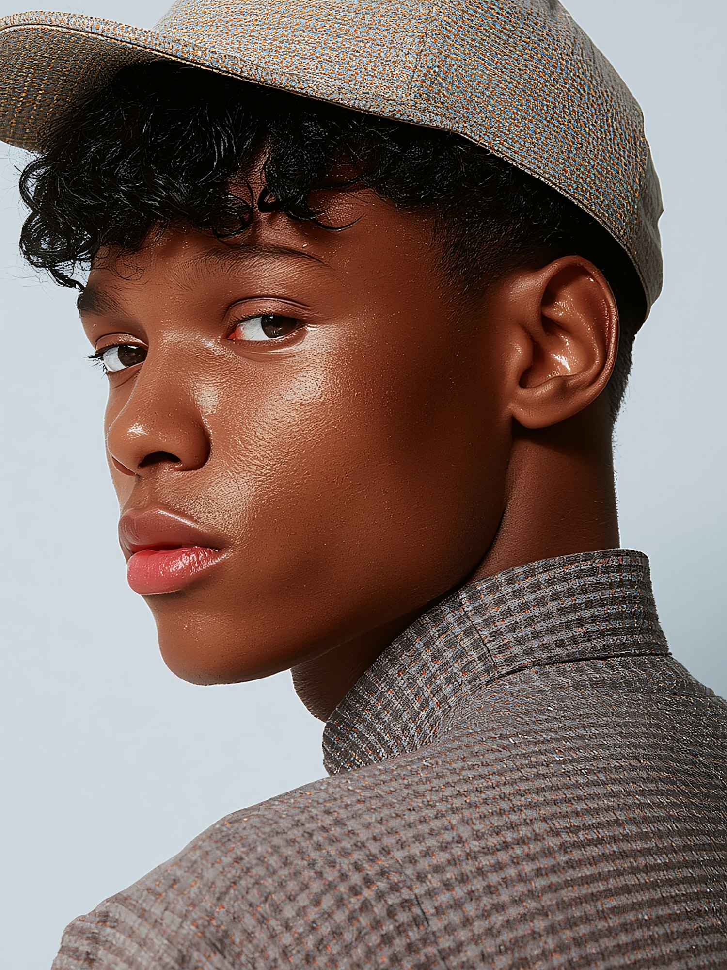 Close-up of a person in a gray cap and shirt, with curly black hair and smooth skin, looking over their shoulder against a light blue background.