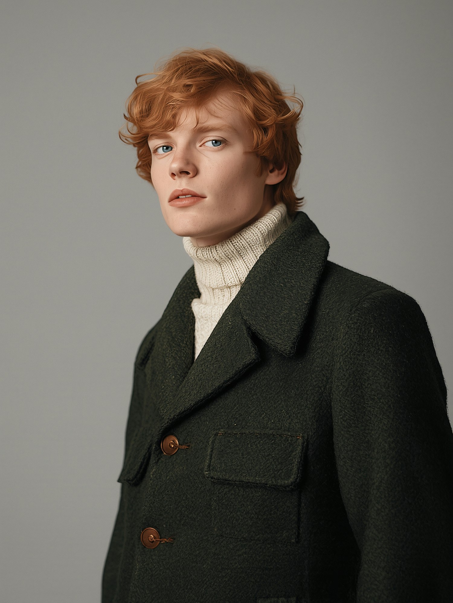 A person with red hair in a green coat and cream sweater poses against a gray background, showcasing a stylish and minimalistic look.