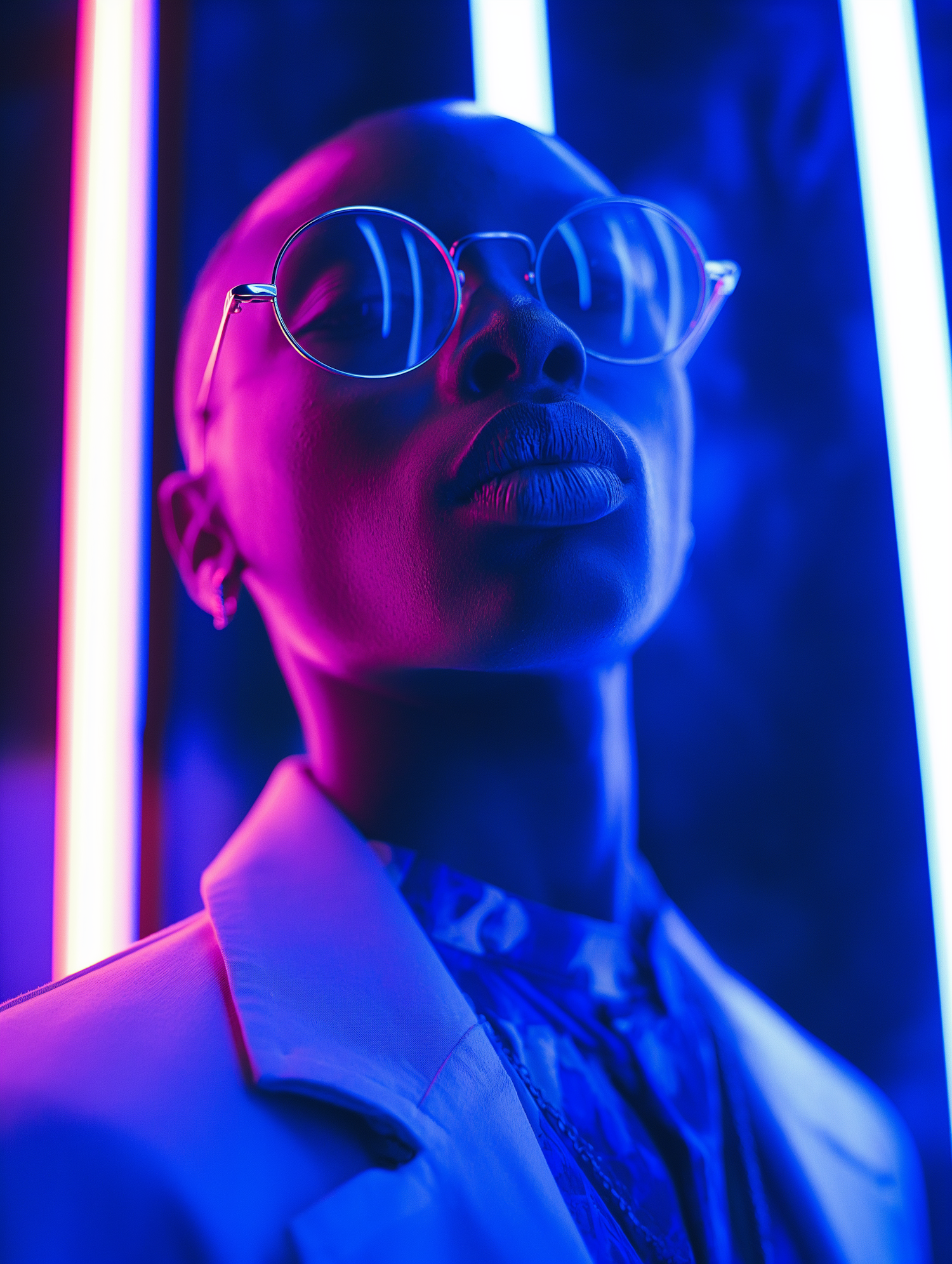 Stylish individual in neon lighting with round glasses, exuding confidence and sophistication in a futuristic setting.