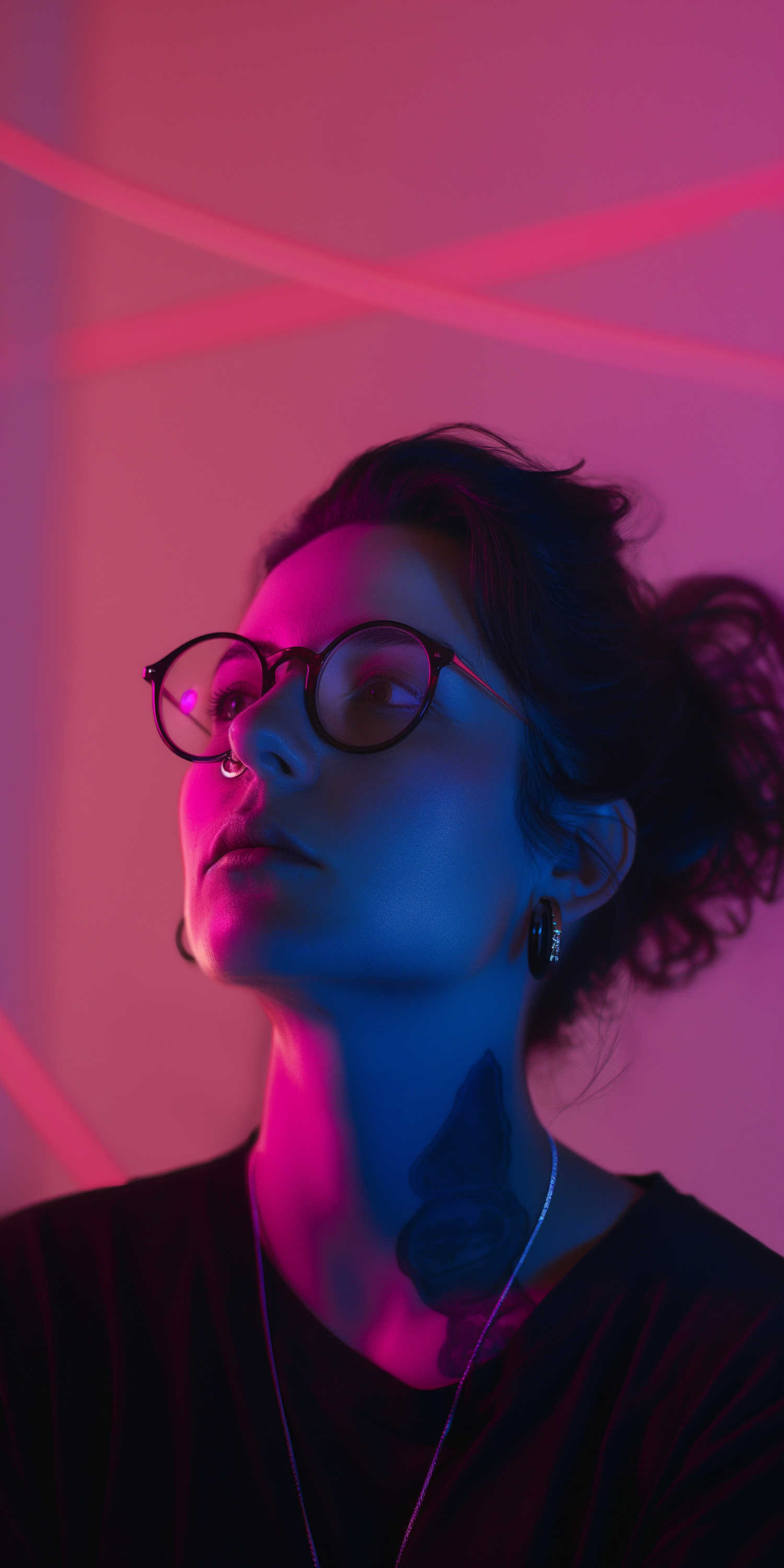 Moody portrait with pink and blue lighting, featuring a person with glasses, a nose ring, and a neck tattoo, gazing upward.