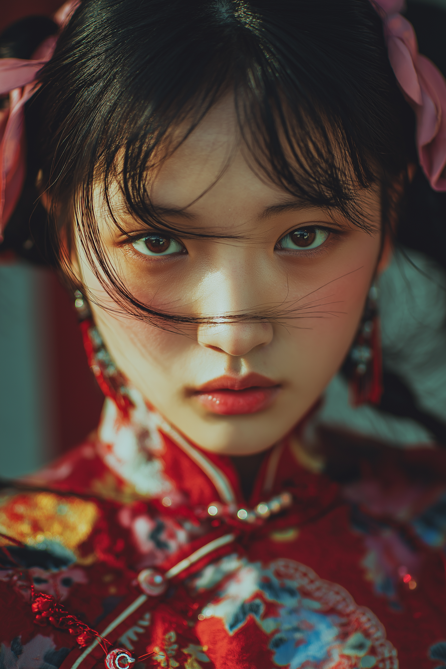 Close-up of a woman in a red floral qipao, with pink ribbons in her hair, gazing intensely under warm lighting.