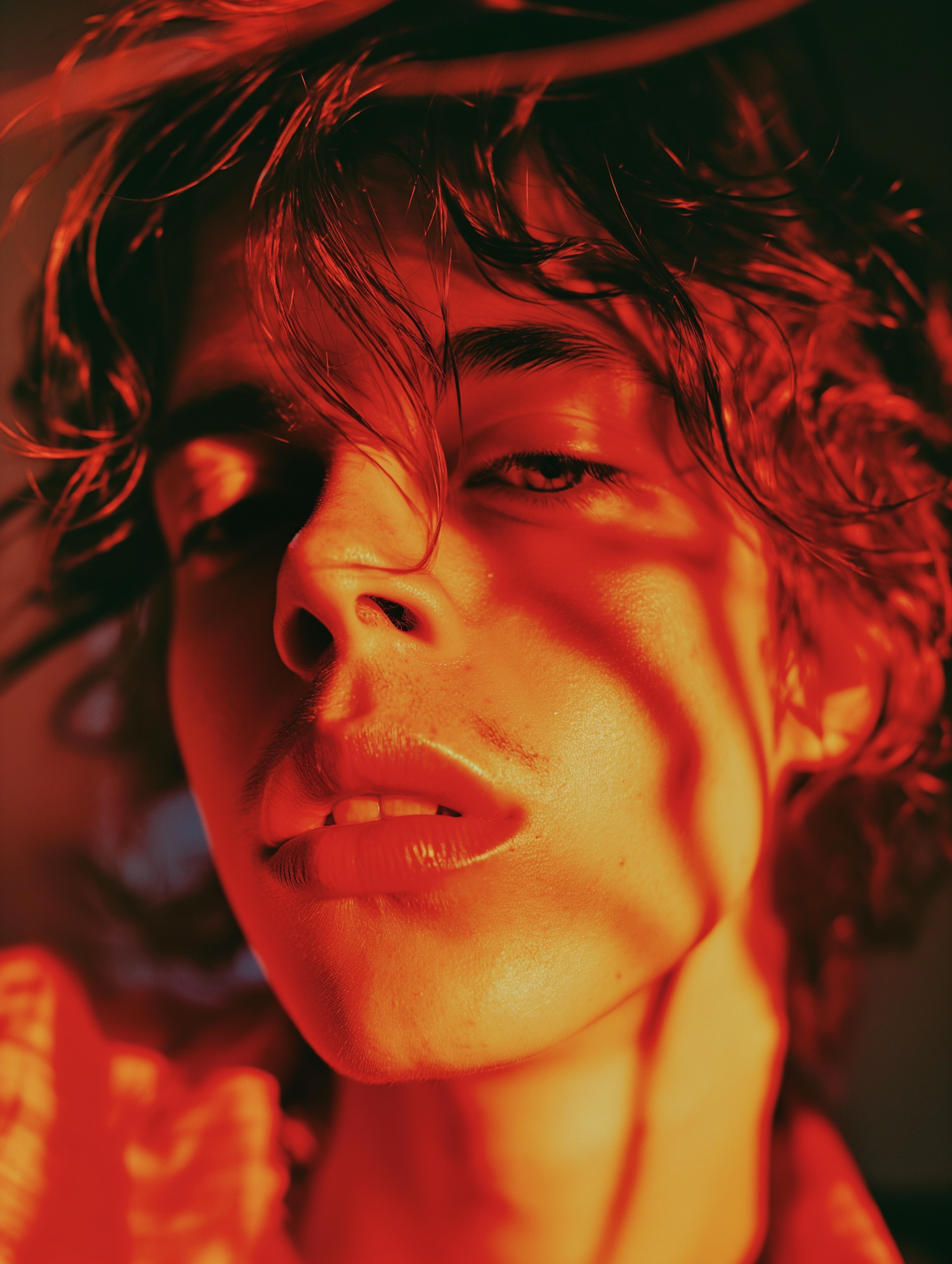 Close-up portrait of a young man with tousled hair, illuminated by warm, dramatic lighting, creating intense shadows and depth.