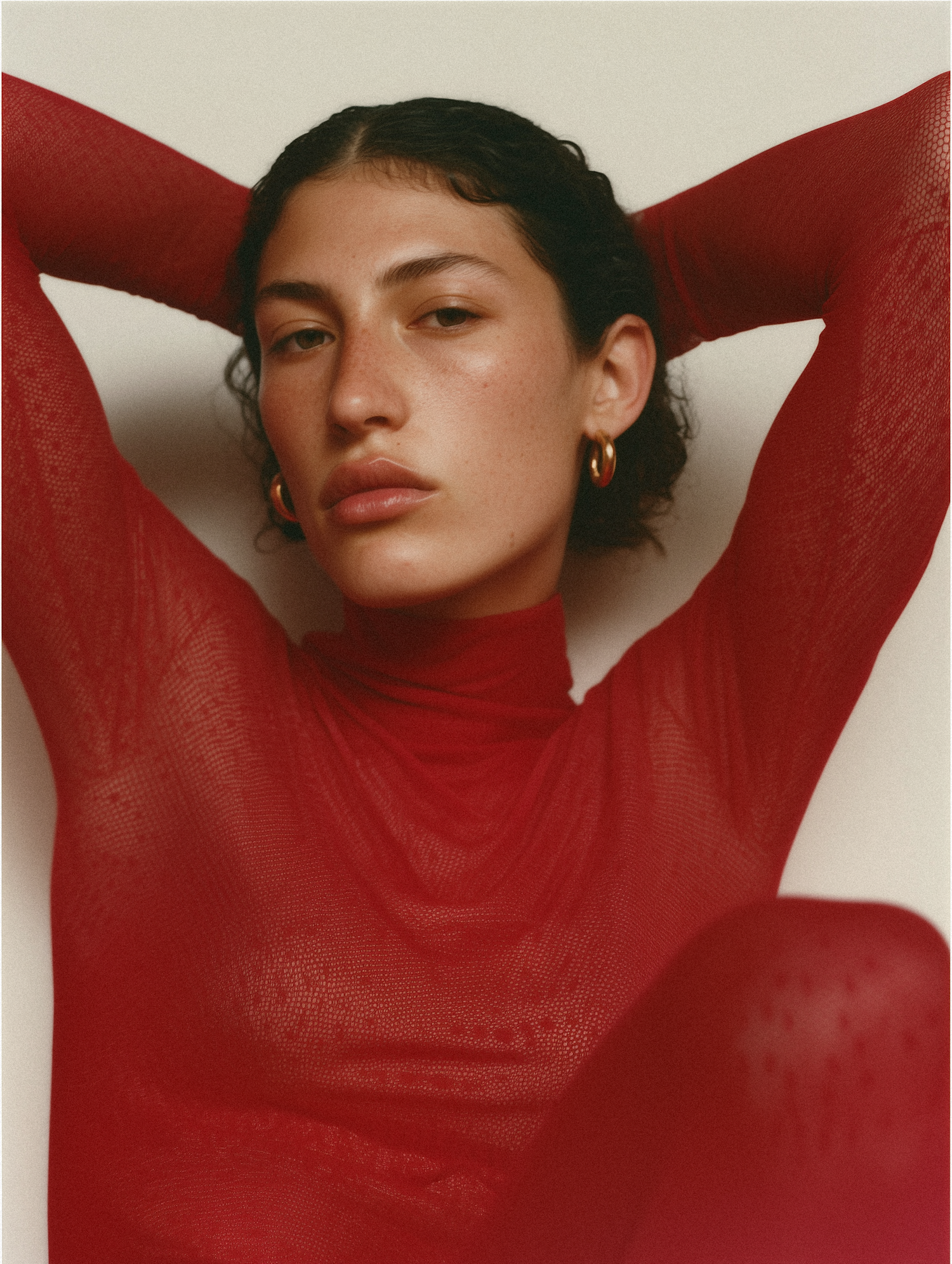 A person in a red, semi-transparent top poses with arms behind their head, wearing gold hoop earrings against a plain background.