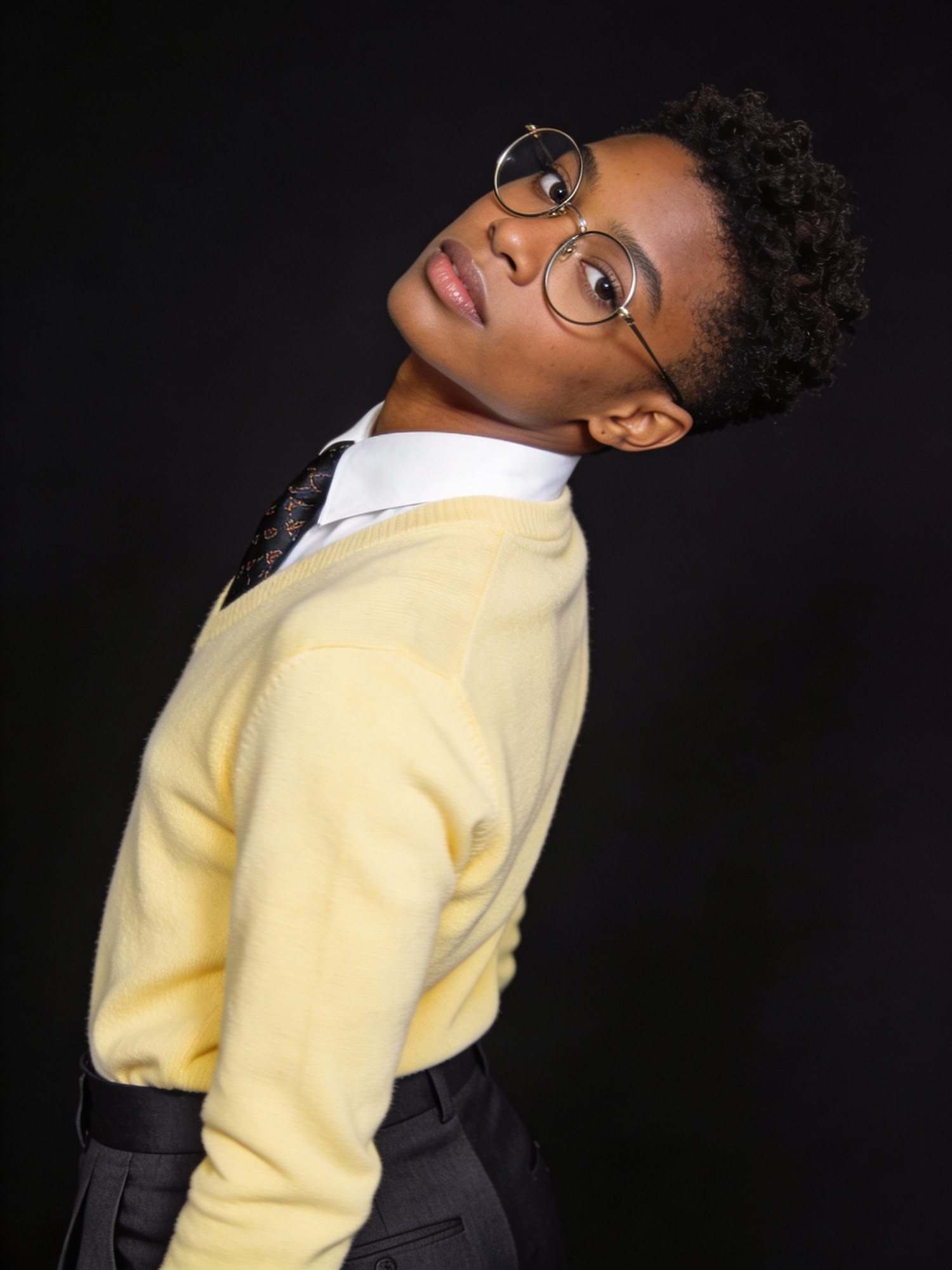 Stylish portrait of a Black person with short curly hair and glasses, wearing a light yellow sweater, white collared shirt, dark patterned tie, and dark trousers. Body turned away from the camera with a sharp over‑the‑shoulder look, chin slightly raised, confident expression. Glossy Y2K lighting, soft glow, clean dark background, fashion‑forward attitude.