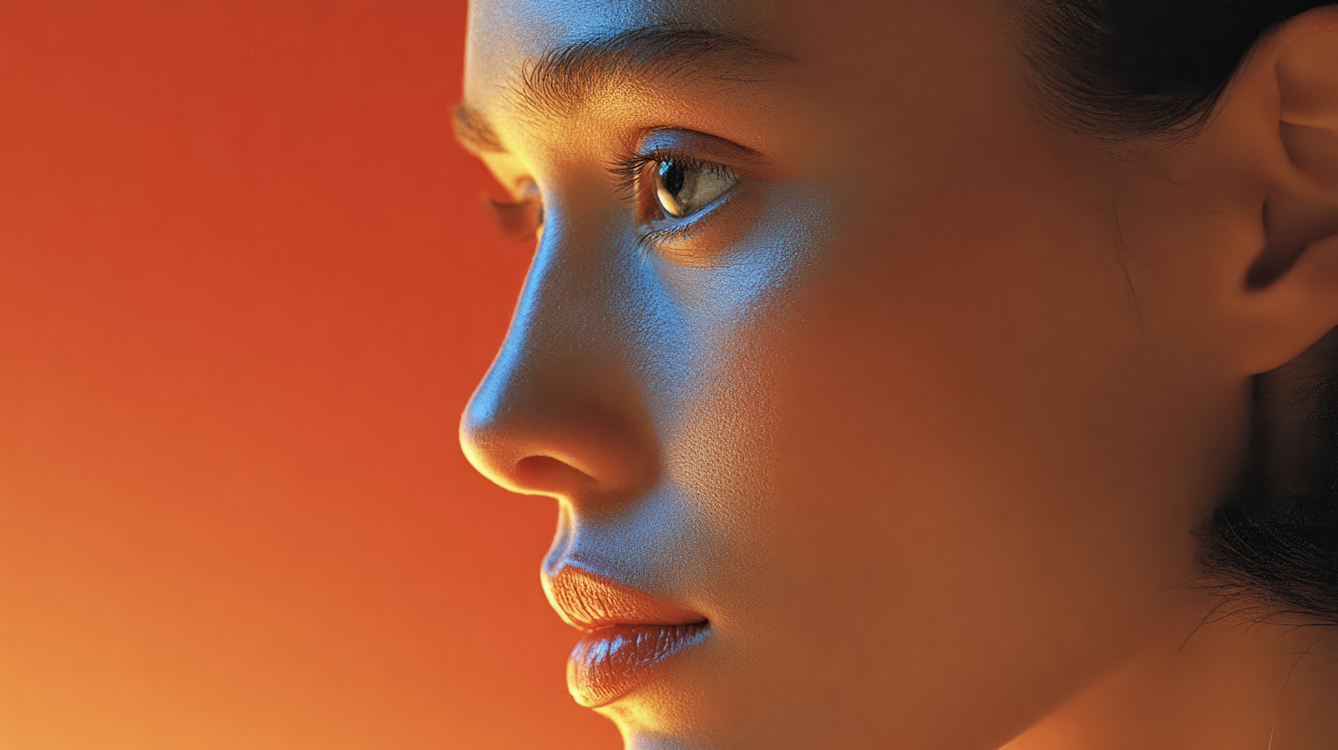 Close-up side profile of a face with warm and cool lighting, emphasizing contours and textures against an orange gradient background.