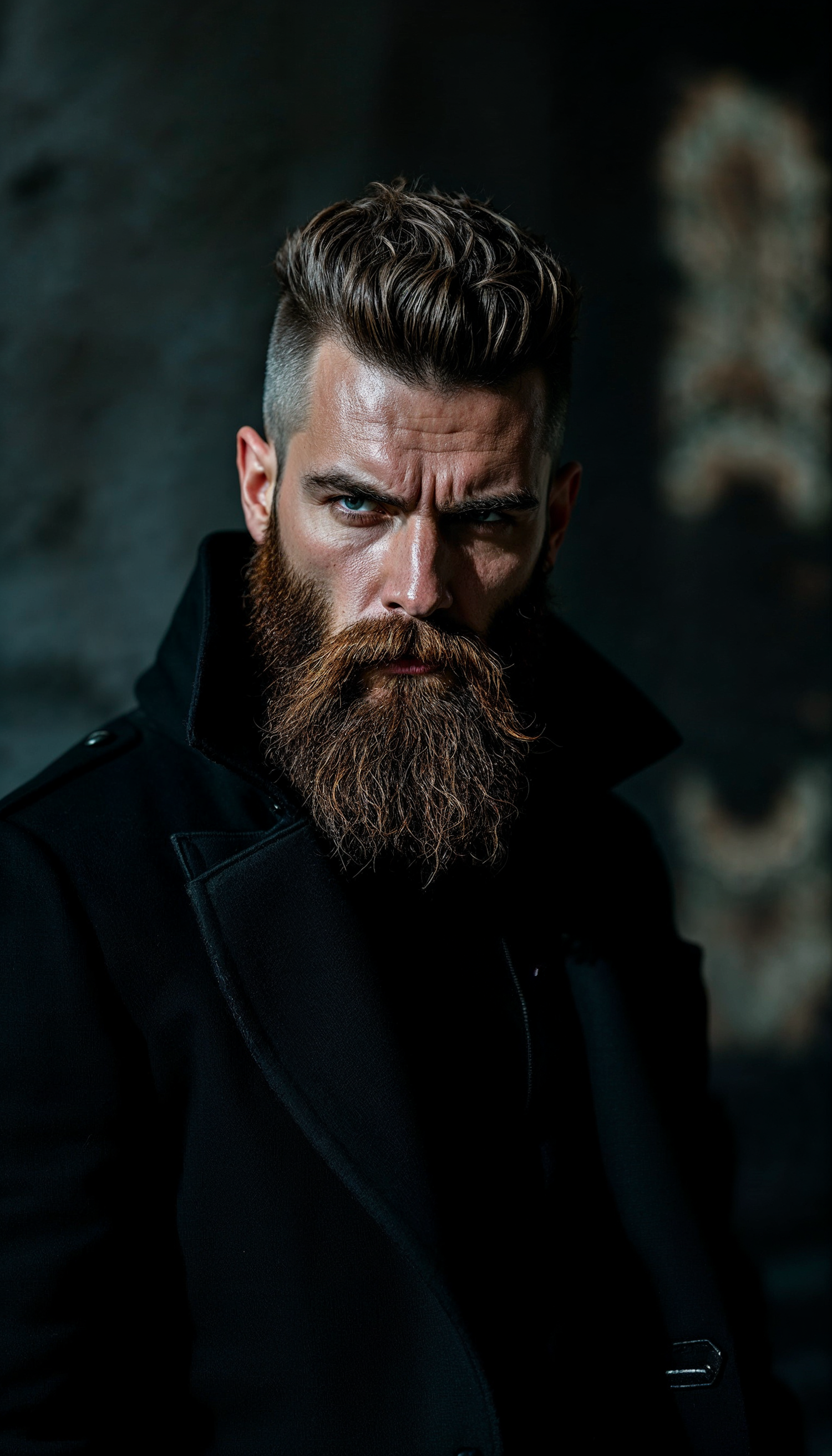 Intense portrait of a bearded man with blue eyes and styled hair, wearing a black coat against a dark background.