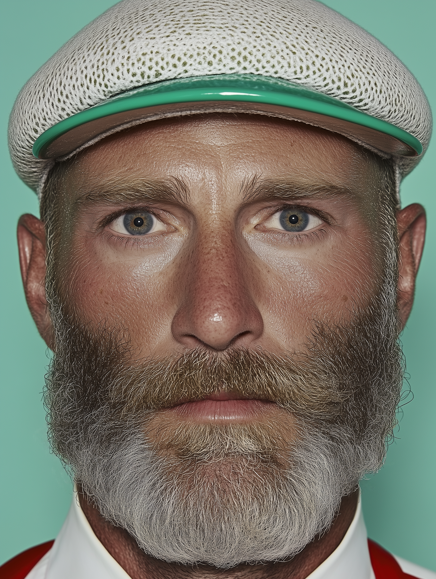 Close-up of a bearded man with blue eyes, wearing a white cap with green trim, against a mint green background.