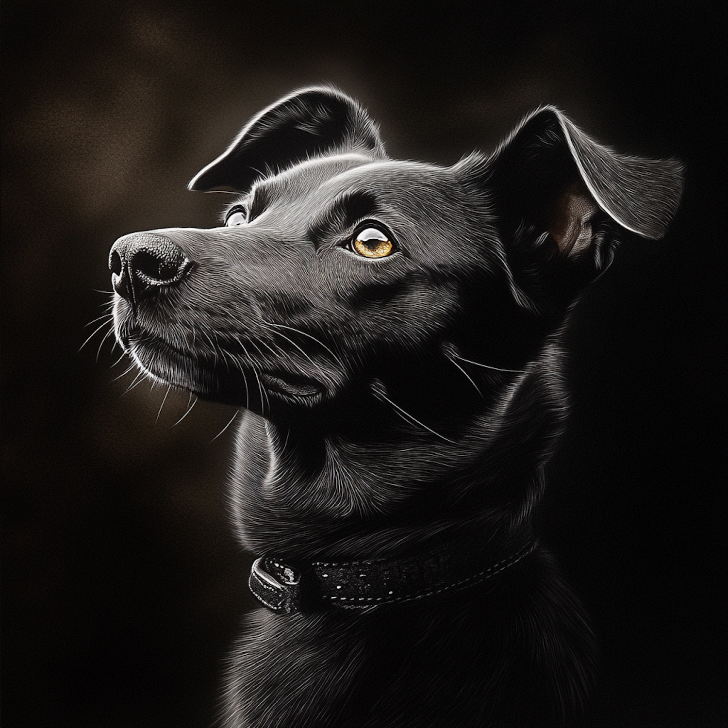 Elegant black dog with golden eyes and a sleek coat, gazing upward against a dark gradient background. Stunning lighting and detail.