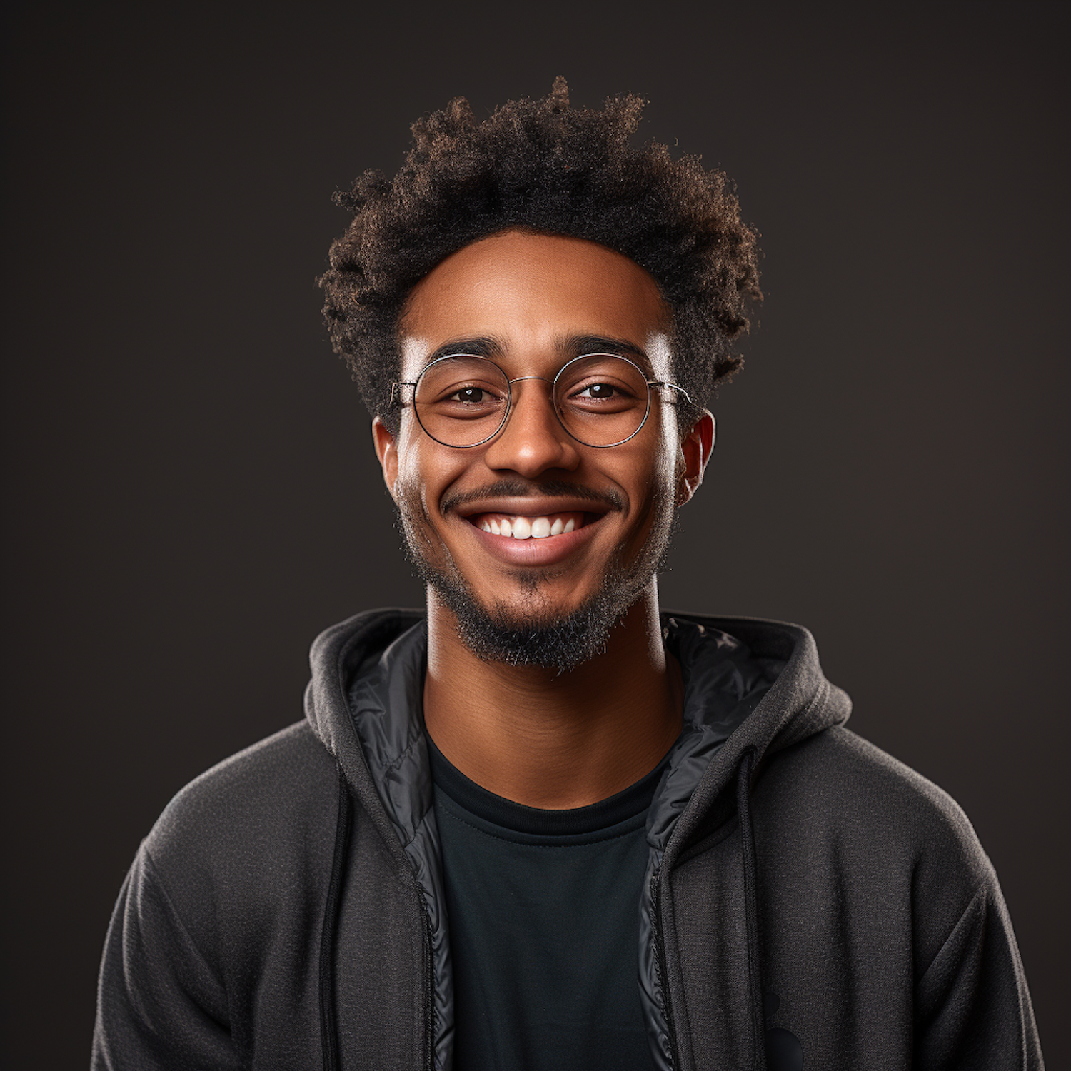 Smiling young man with glasses and a hoodie against a dark background, exuding warmth and friendliness.