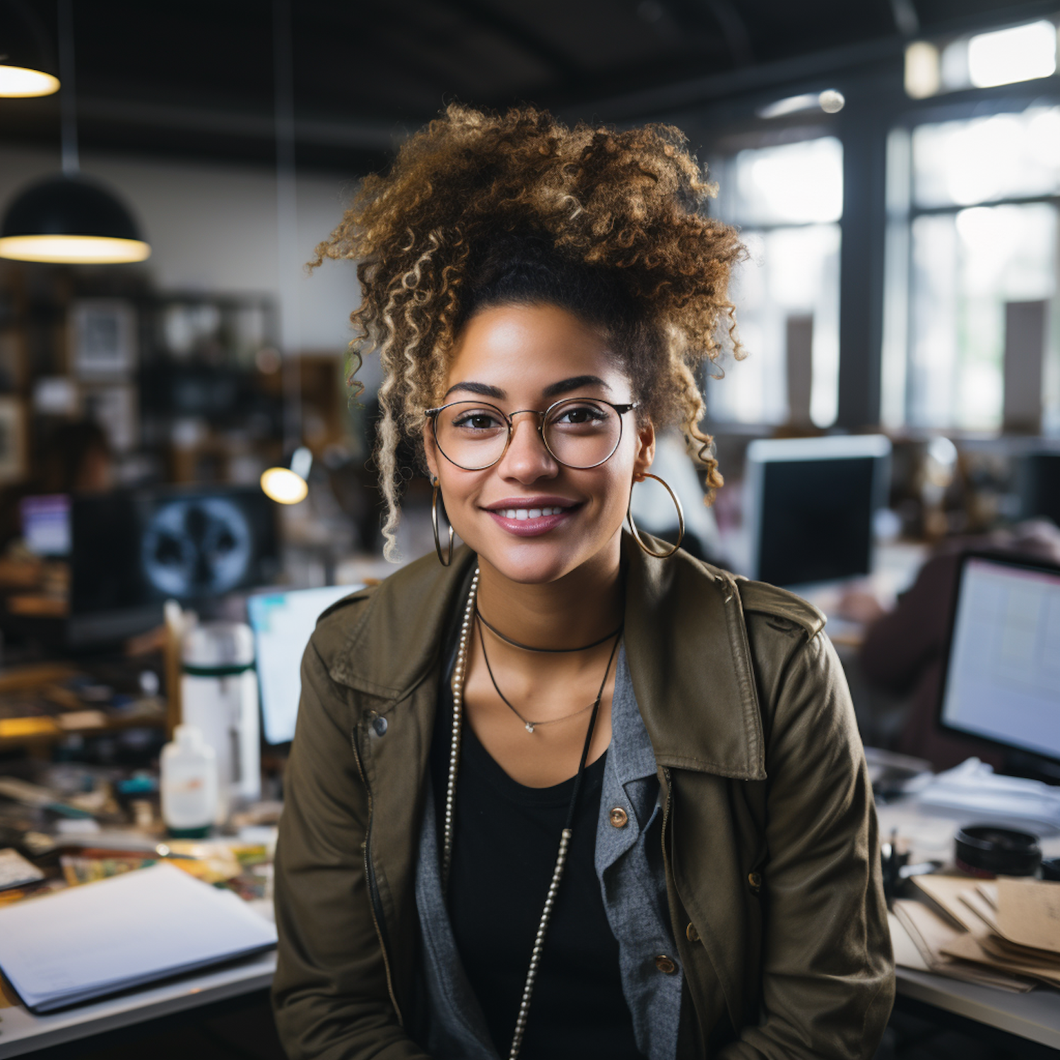 Confident young woman with curly hair and glasses in a modern office setting, exuding style and professionalism.