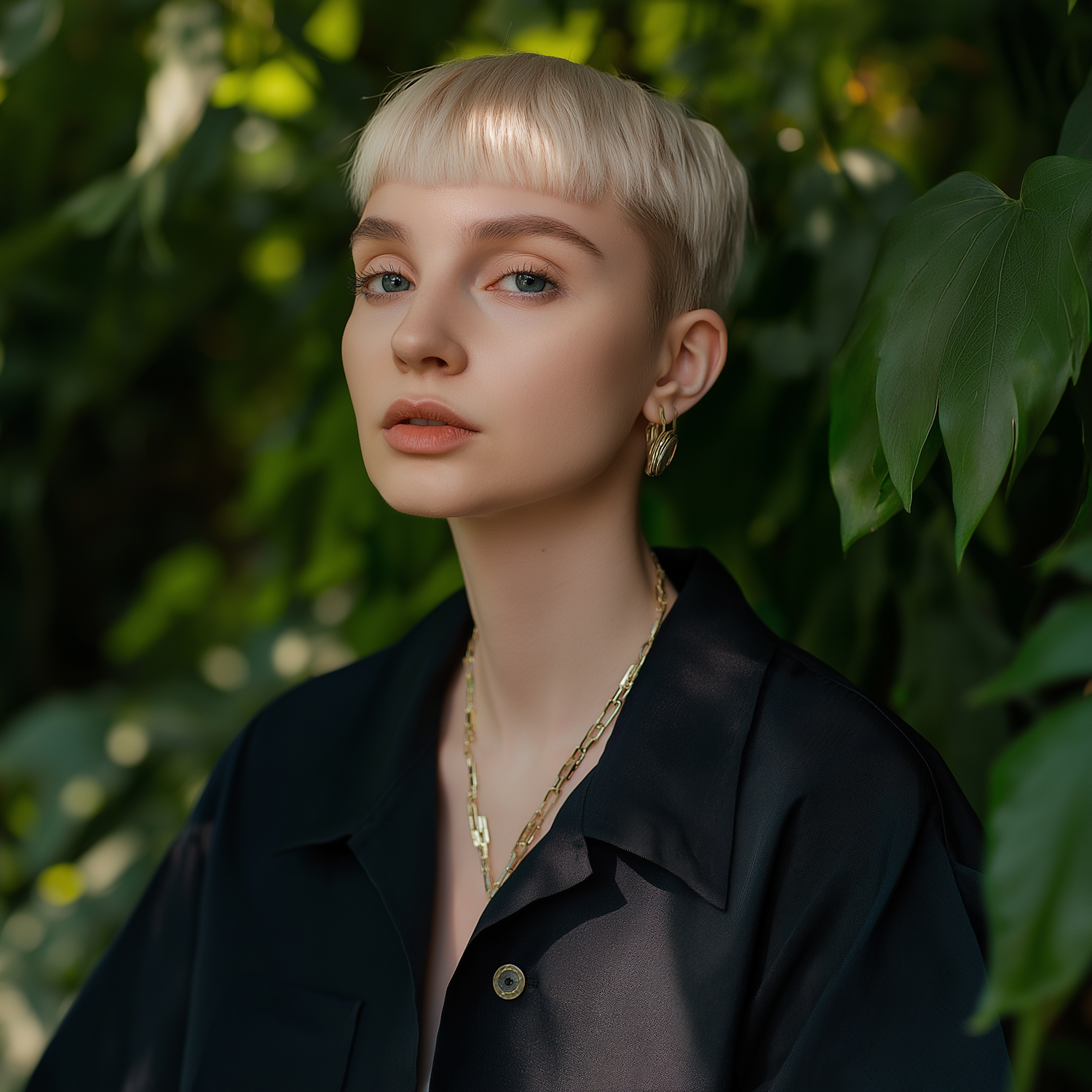 Young woman with platinum blonde hair and gold accessories against a lush green background, wearing a black shirt.
