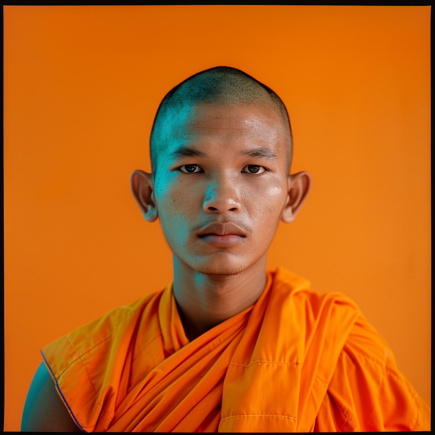 Portrait of a young Asian monk in a saffron robe against a vibrant orange background, with soft blue lighting on his face.