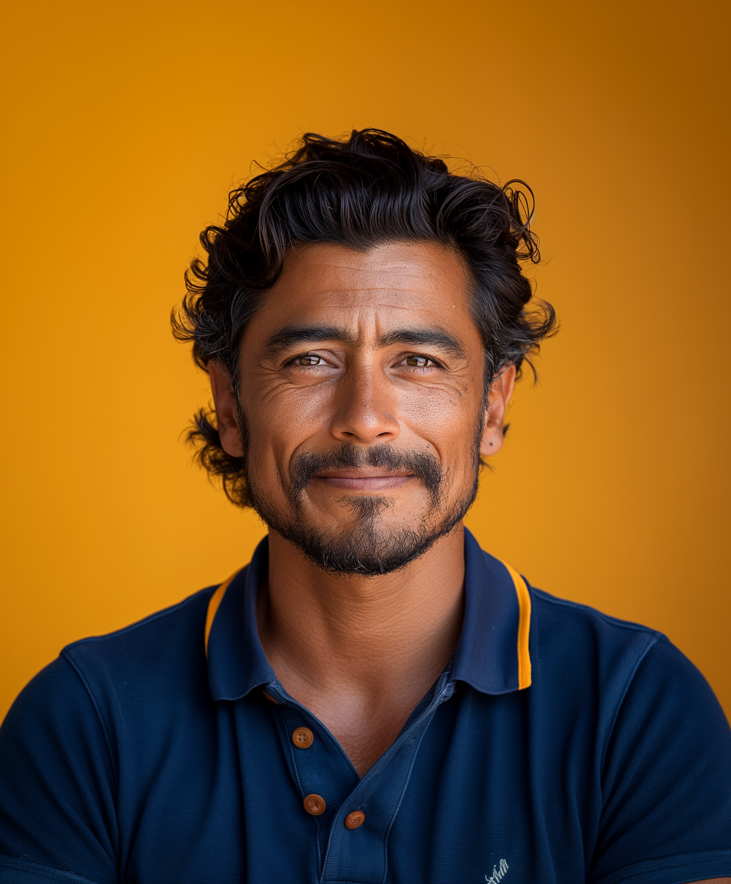 Portrait of a man with curly black hair and a beard, wearing a navy polo against a vibrant orange background.