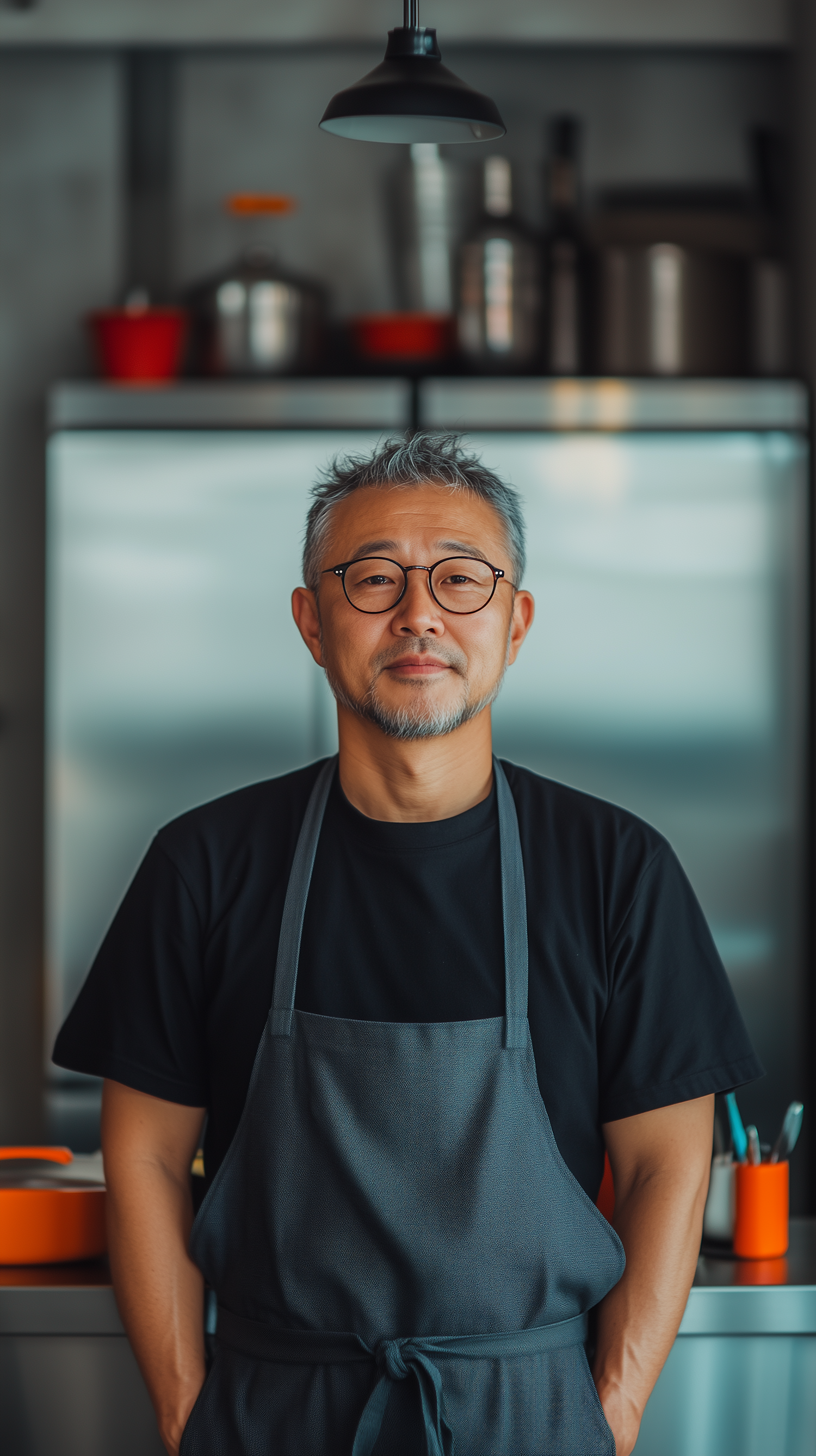 Asian man with gray hair and glasses in a modern kitchen, wearing a black t-shirt and apron, with stainless steel appliances in the background.
