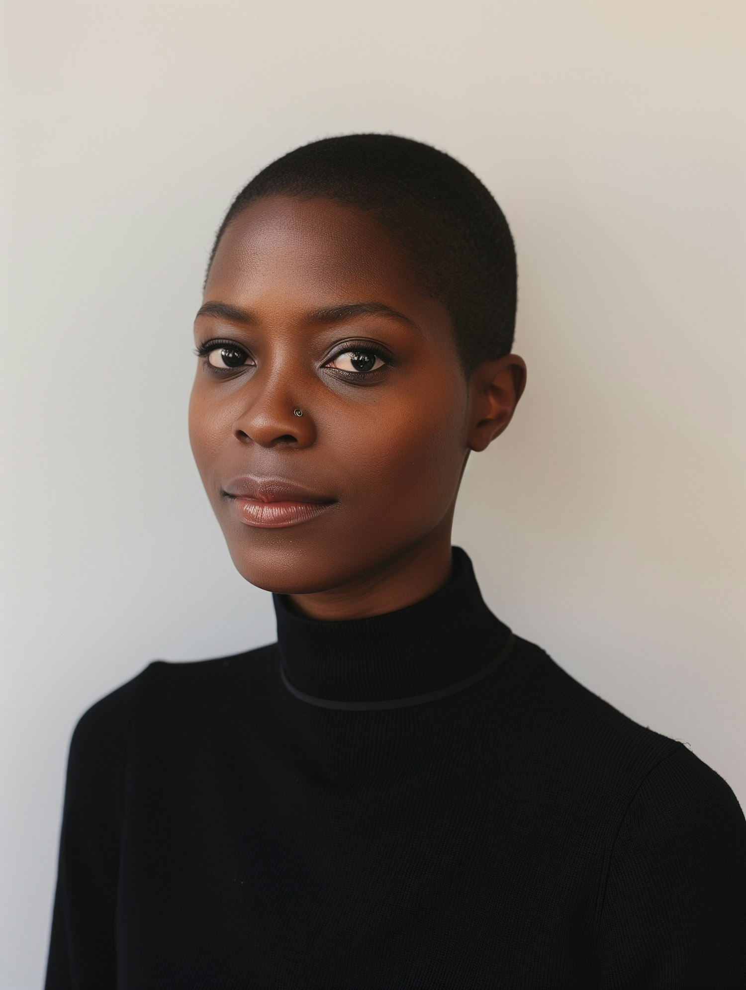 Portrait of a confident Black woman with short hair and a nose piercing, wearing a black turtleneck against a neutral background.