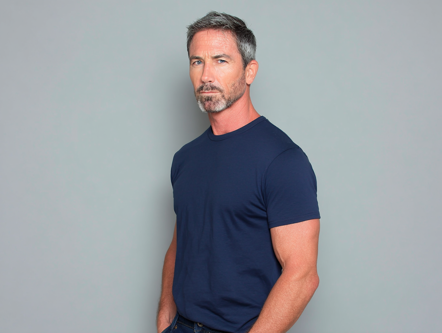 Man in a navy blue t-shirt posing against a soft gray background in a professional portrait setting.