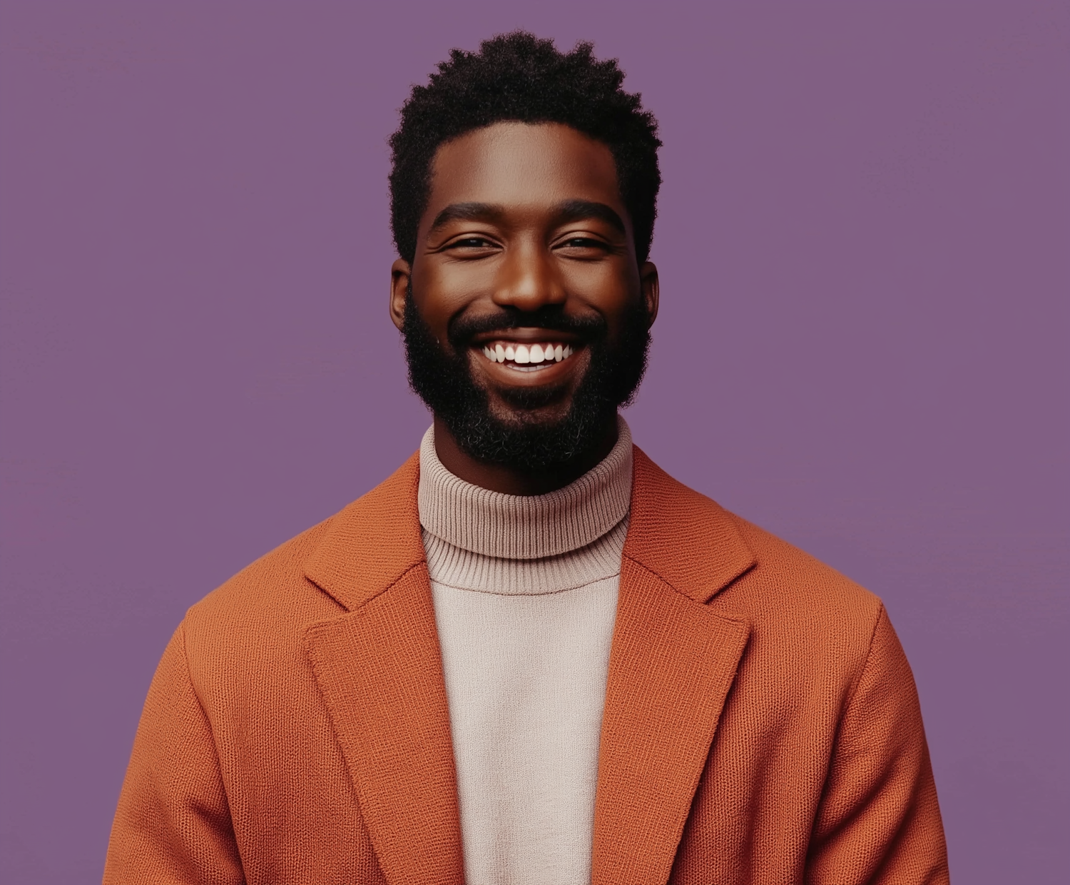 Smiling Black man in orange blazer and beige turtleneck against a purple background, exuding warmth and style.