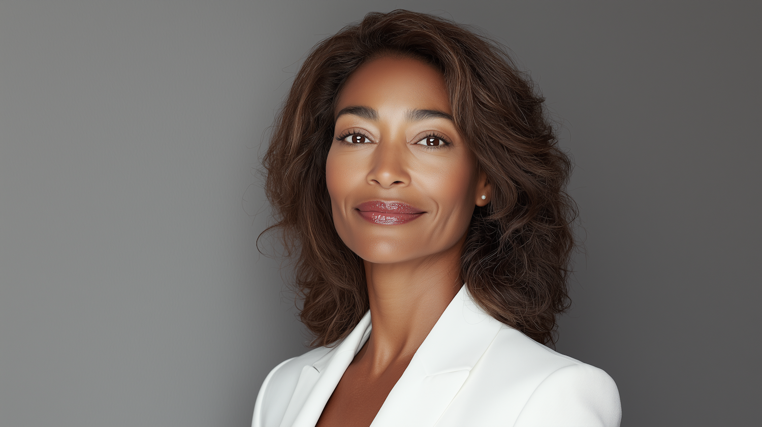 Confident woman with brown hair and white blazer against a gray background, exuding elegance and professionalism.