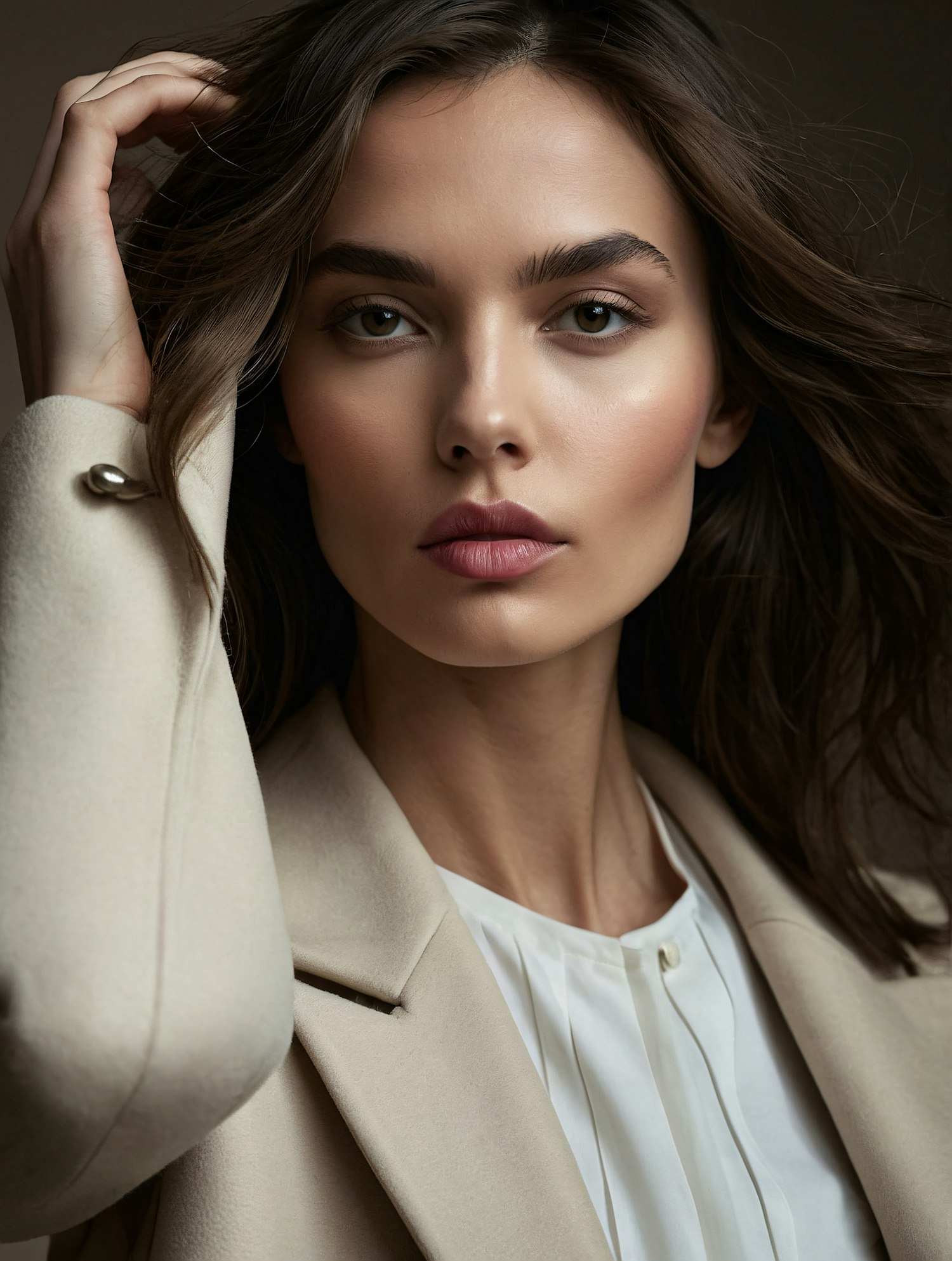 Elegant portrait of a young woman with green eyes, wearing a beige blazer and white blouse, exuding confidence and sophistication.