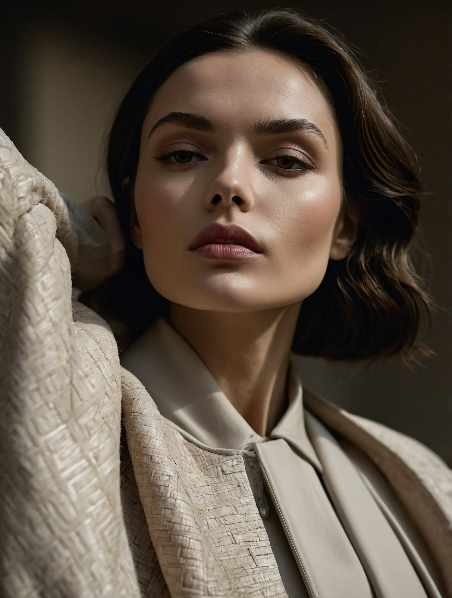 Elegant attire with a textured beige jacket and light shirt, complemented by wavy dark brown hair. Face blurred for privacy.