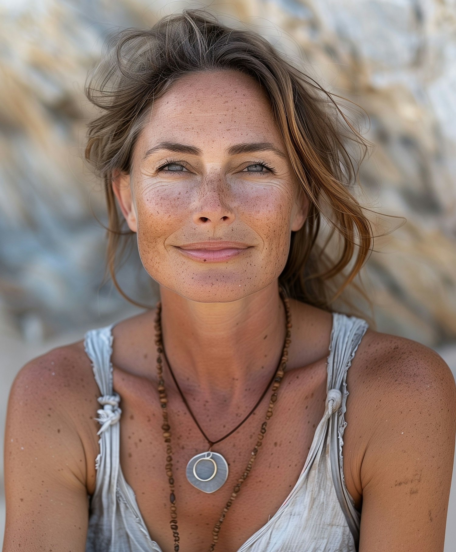 Serene portrait of a freckled woman with light brown hair and blue eyes, wearing a beaded necklace and a light top, set against a blurred background.