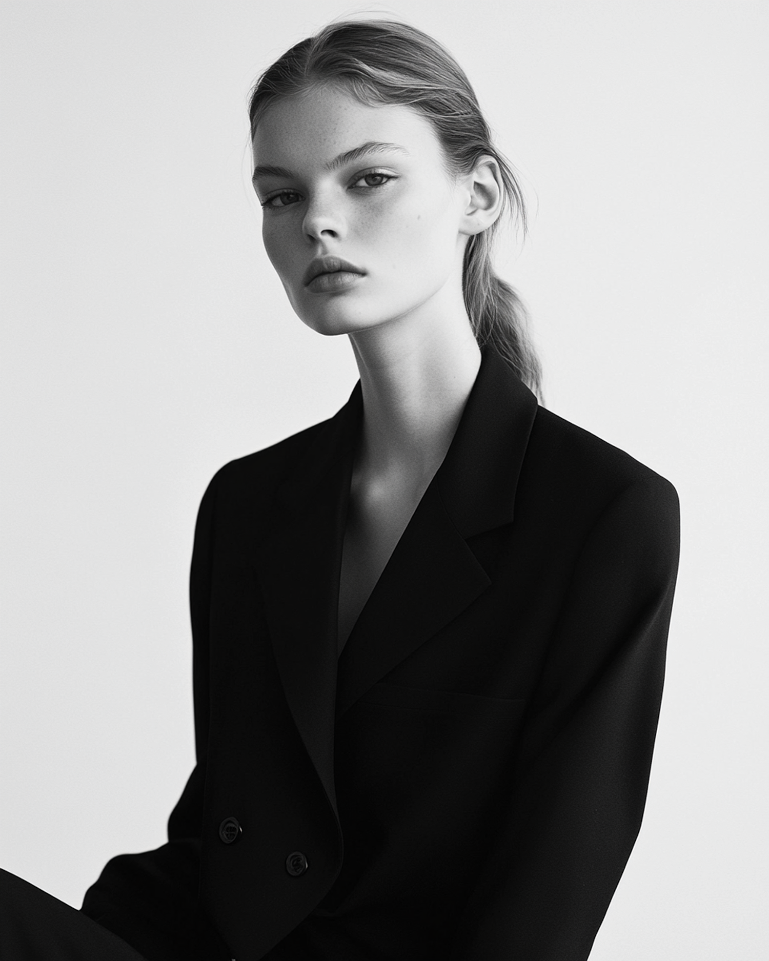 Black and white portrait of a young woman in a black blazer, with light hair pulled back, exuding elegance and poise.