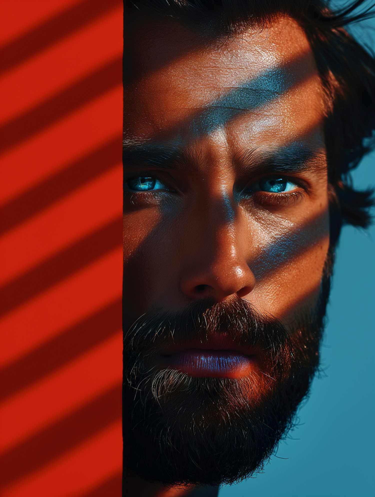 Close-up portrait of a bearded man with blue eyes, dramatic lighting, and a bold red background.