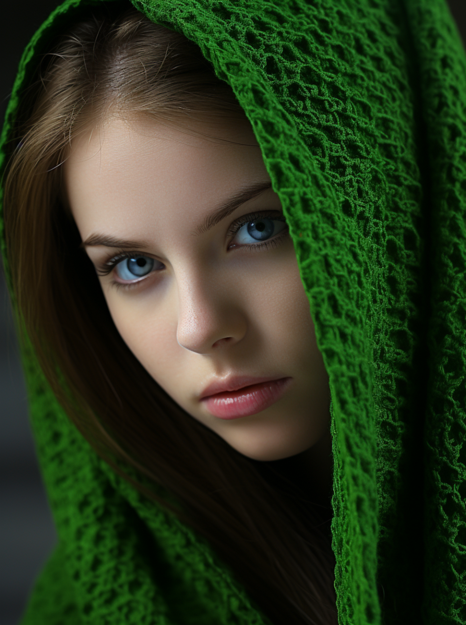 Young woman with blue eyes and green shawl, gazing intently. Striking contrast between shawl and fair skin. Calm, contemplative expression.
