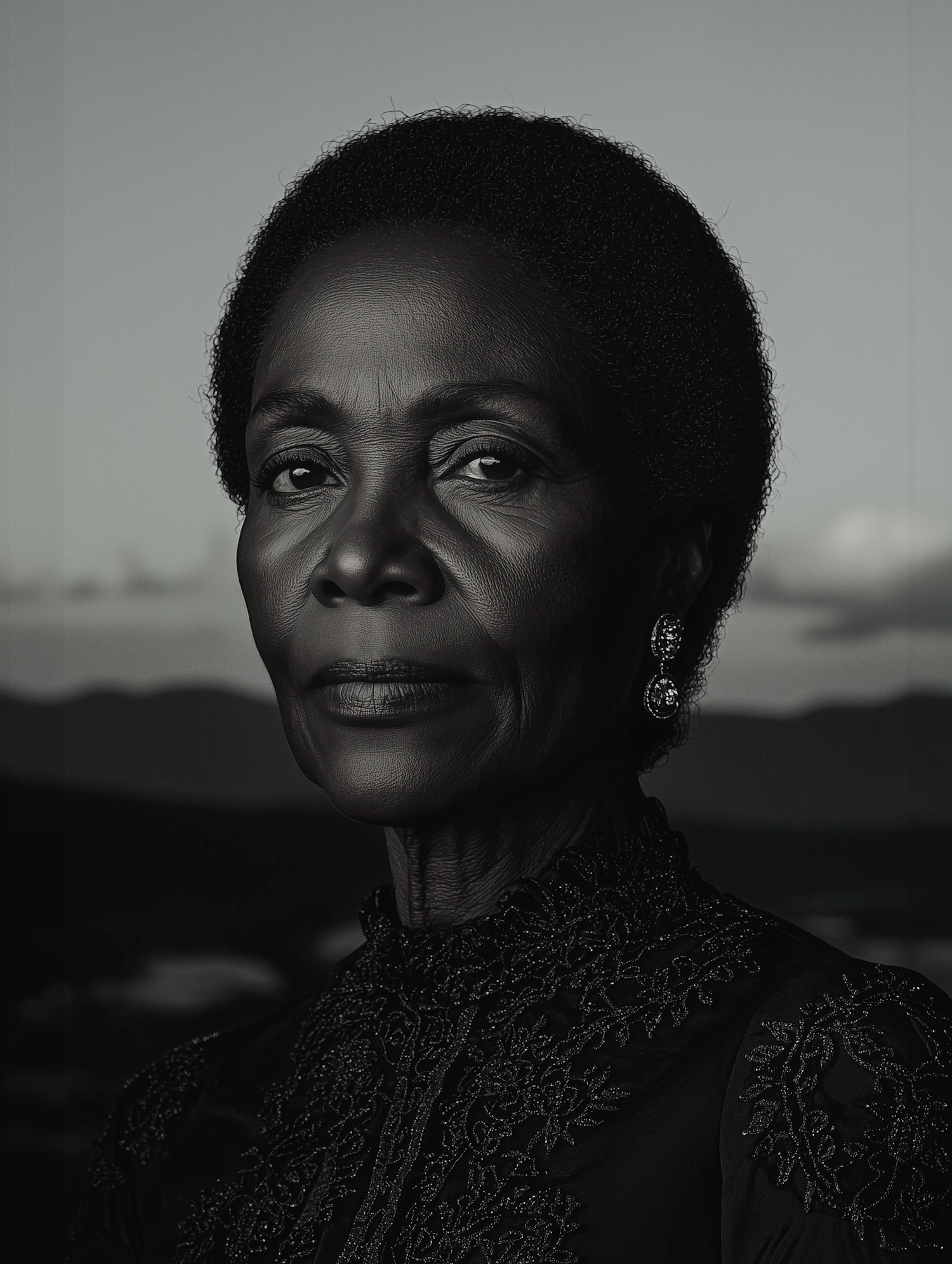 Elegant portrait of an elderly Black woman with a calm expression, wearing intricate attire and earrings, set against a blurred natural backdrop.