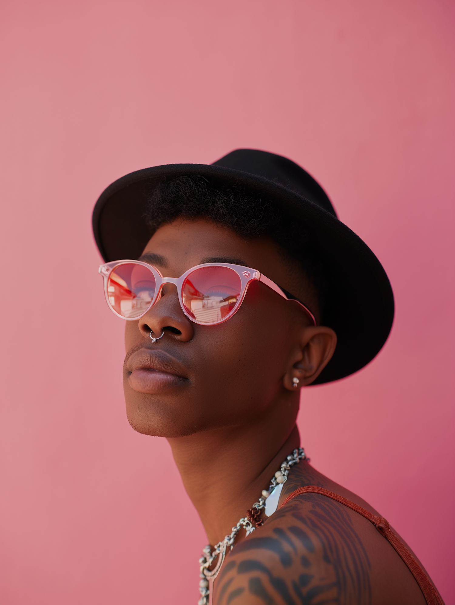 Stylish portrait of a young person with pink sunglasses, black hat, and bold tattoo against a pink background.