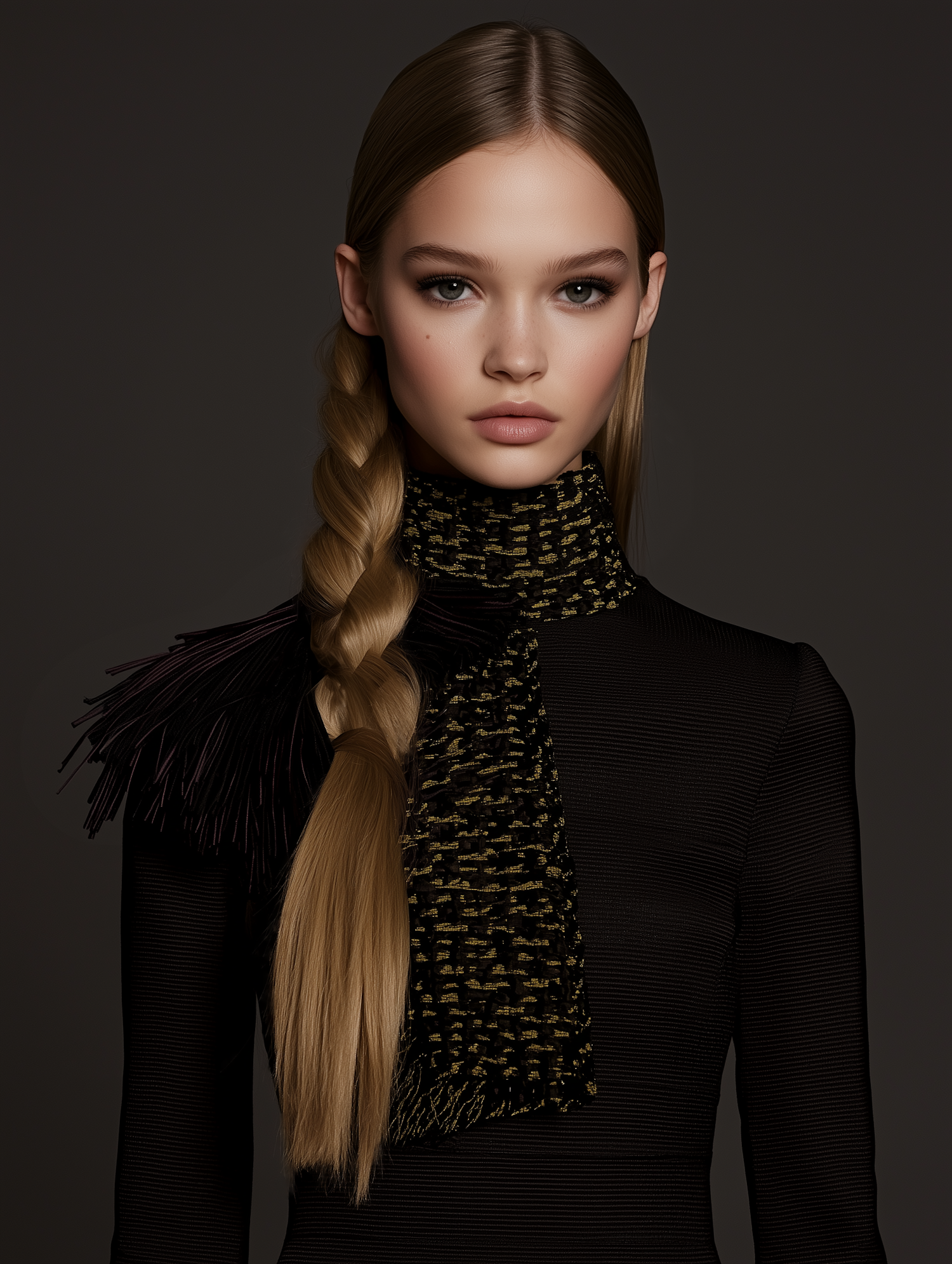 Elegant woman with blonde braid and textured black top, featuring feather-like shoulder detail, against a dark background.