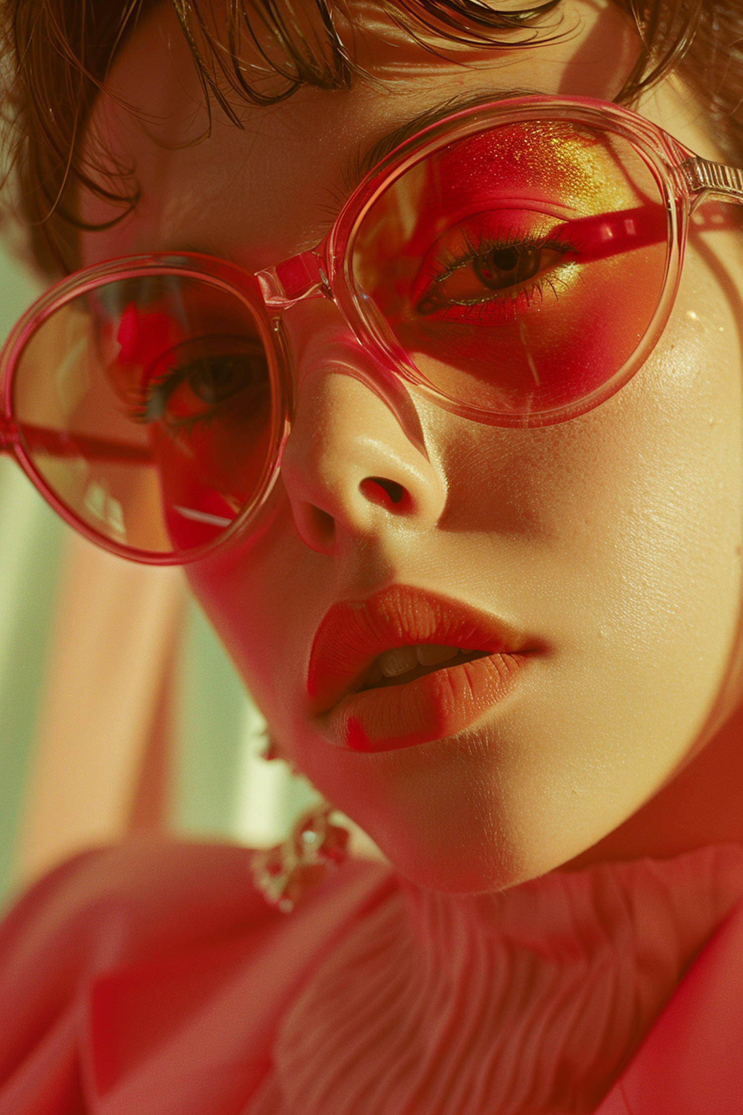 Close-up of a woman with red sunglasses and bold makeup, featuring red and gold eyeshadow and matching lipstick.