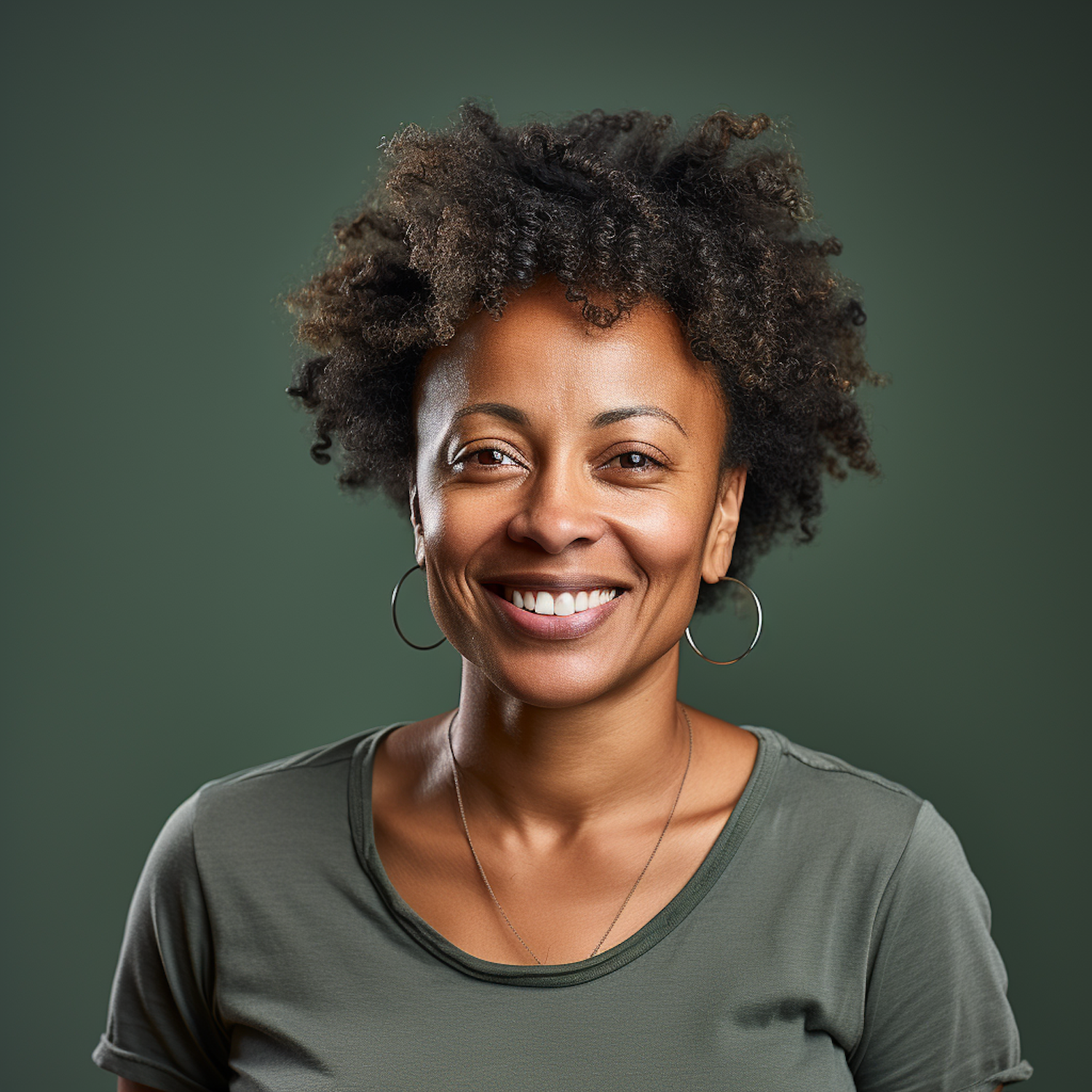 Smiling Black woman with curly hair and hoop earrings against a green background, wearing a green t-shirt.