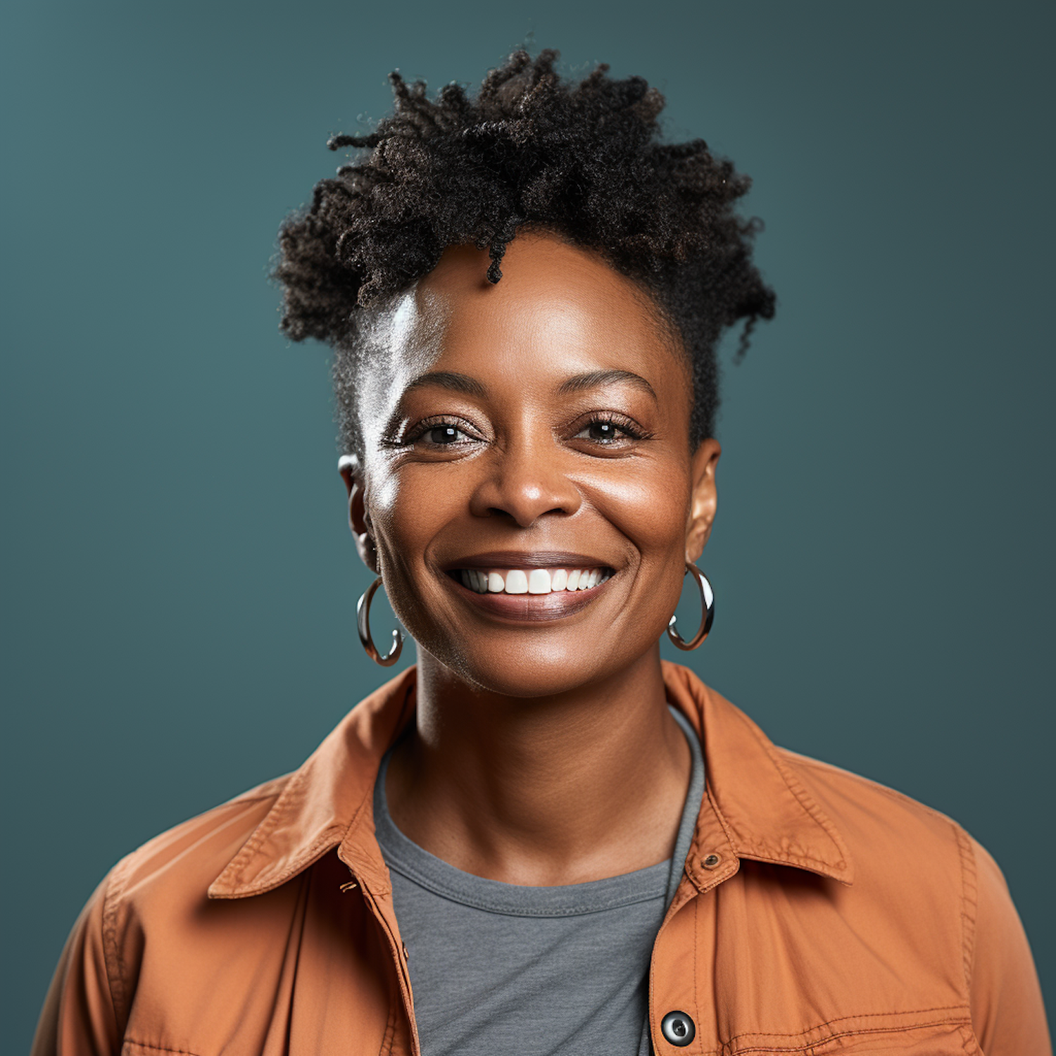 Smiling Black woman with curly hair, hoop earrings, and casual attire against a teal background.