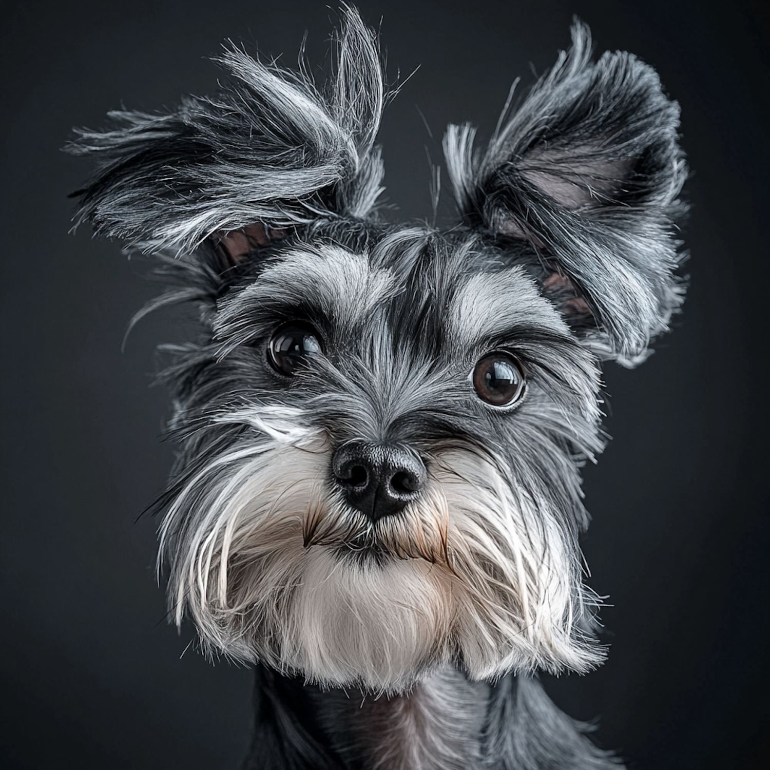 Close-up of a small dog with fluffy black and gray fur, expressive eyes, and perked ears against a dark background.