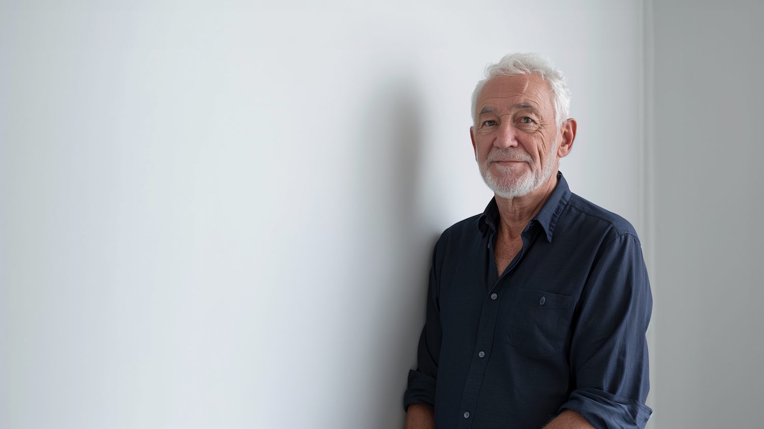 Older man with white hair and beard in a dark blue shirt, standing against a white wall with a gentle smile.