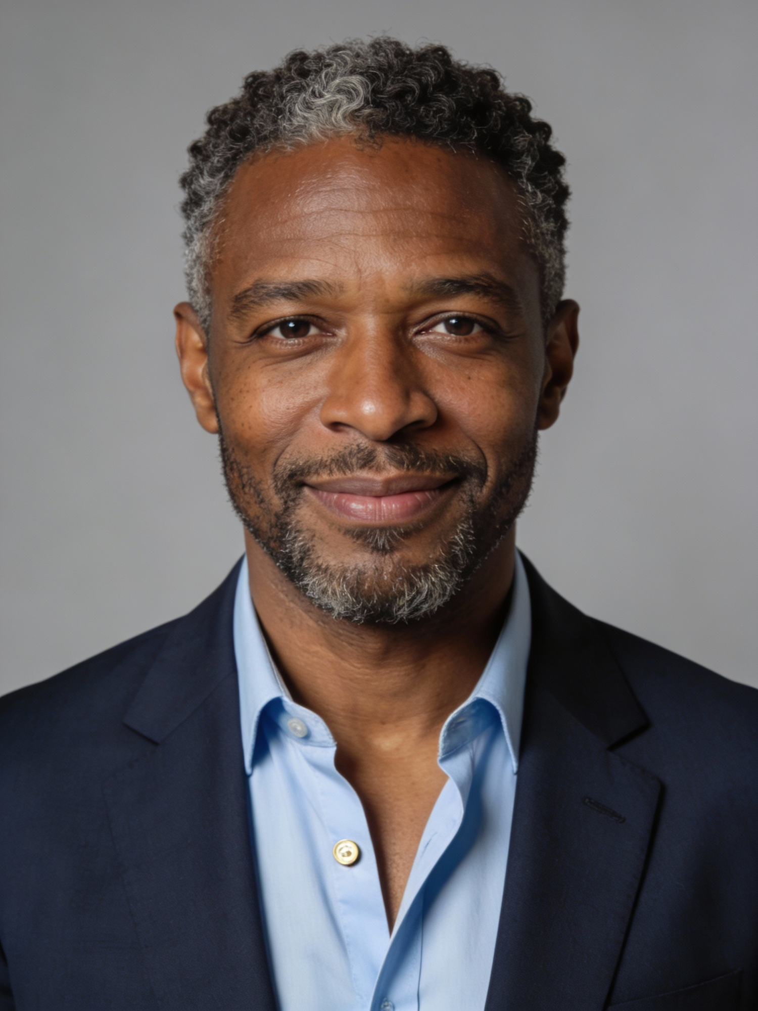 Studio portrait of a Ghanaian–German male, age 45; medium-deep brown skin, neutral-warm undertone; short tight curls with a few gray strands at the temples; neatly trimmed short beard; navy suit jacket over a pale blue shirt, top button open, no tie; neutral mid-gray seamless backdrop; Rembrandt lighting with soft fill; 105 mm macro-sharp. Expression: relaxed but authoritative, soft closed-mouth smile with calm, direct gaze. Framing: portrait orientation, 3:4 ratio; mid-chest-up composition. Subject centered, camera at eye level, facing directly toward the camera. Full head and hair inside the frame with a small space above; both shoulders visible, no cropping at the top or sides. Neutral studio composition, no props.