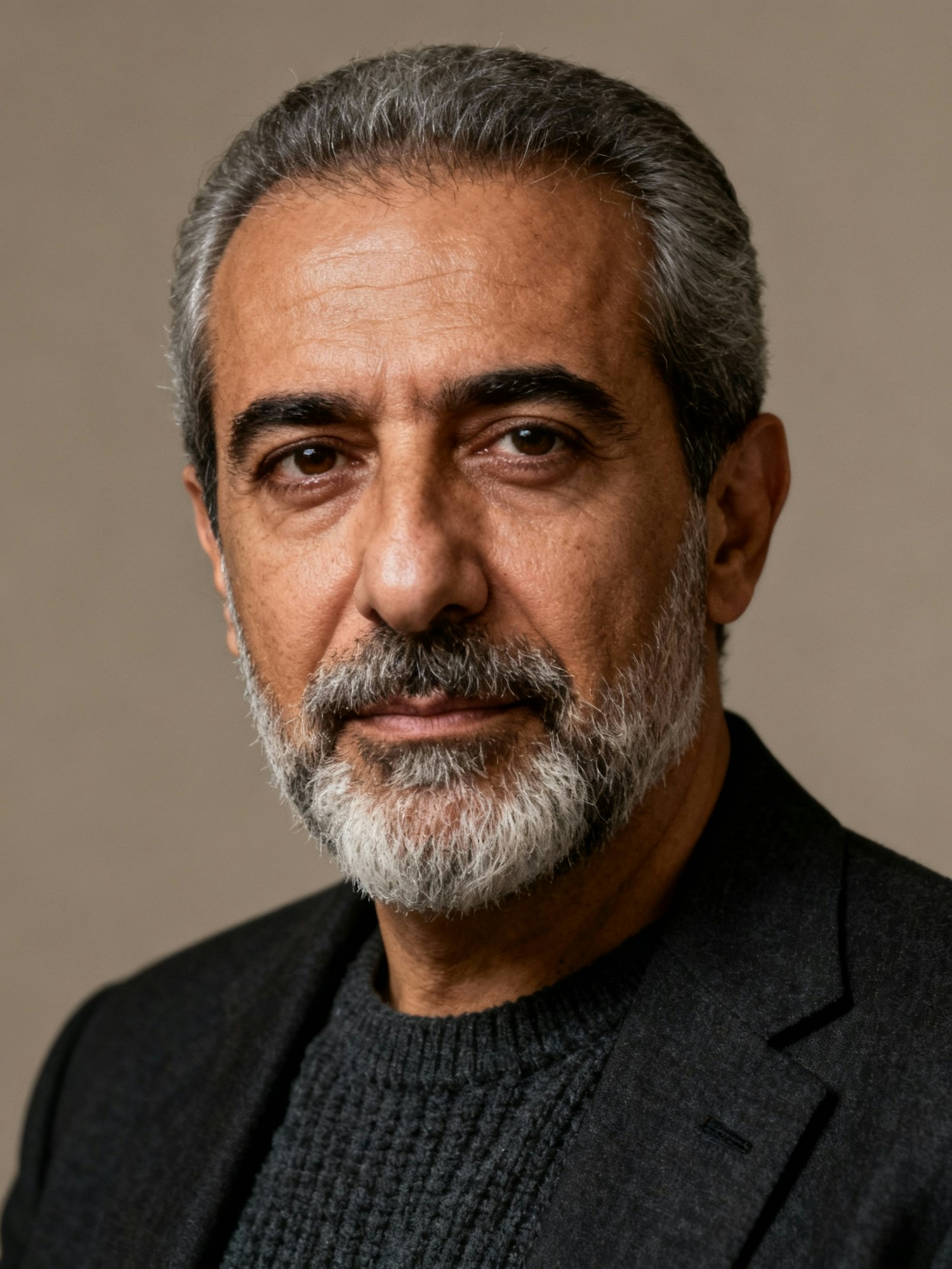 Portrait of a middle-aged man with gray hair and beard, wearing a black blazer and sweater, set against a neutral background.
