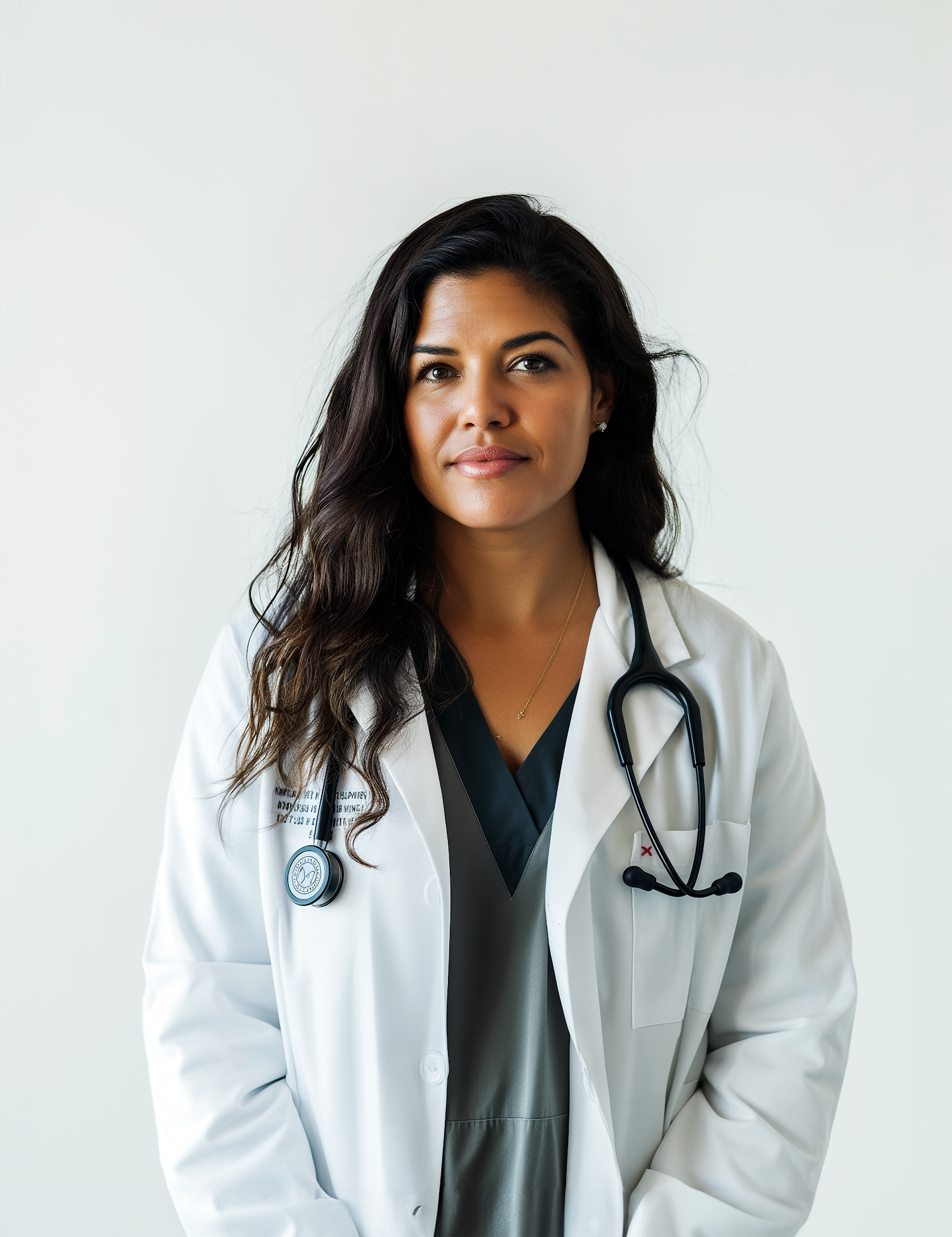 Confident female doctor with long dark hair and stethoscope, wearing a white coat against a plain background.